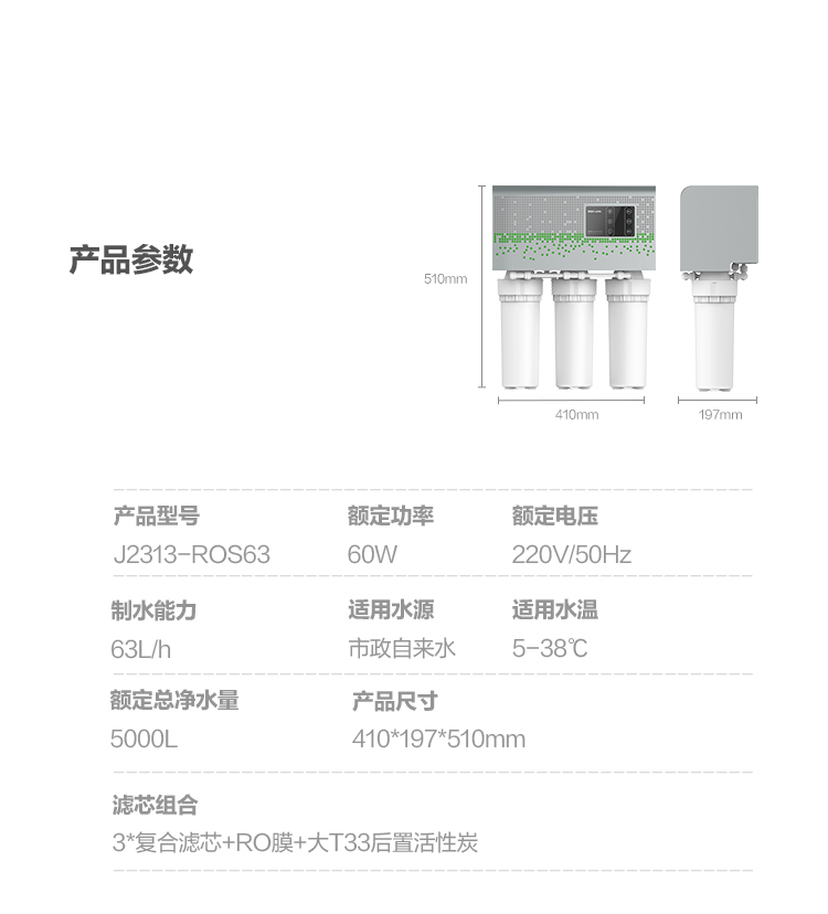 安吉尔(Angel) 商用净水器五层过滤 写字楼办公室净水机J2313-ROS63 63升/小时 400G大通量 白色