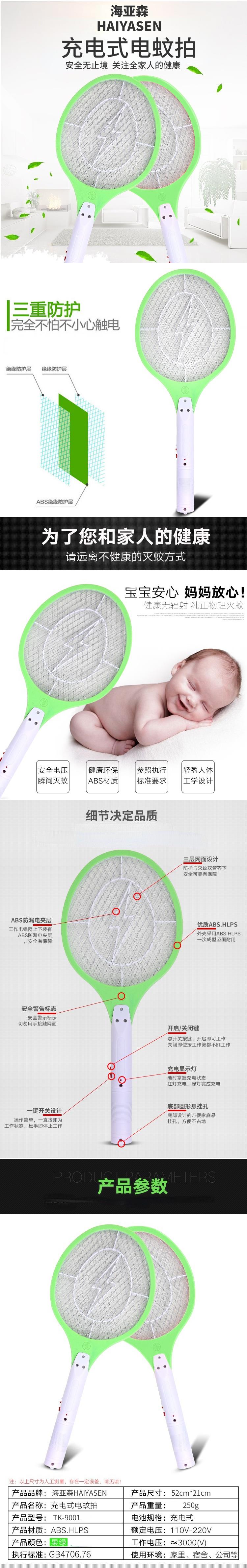 海亚森(HAIYASEN) TK-9001 充电式电蚊拍 1把/箱 绿色