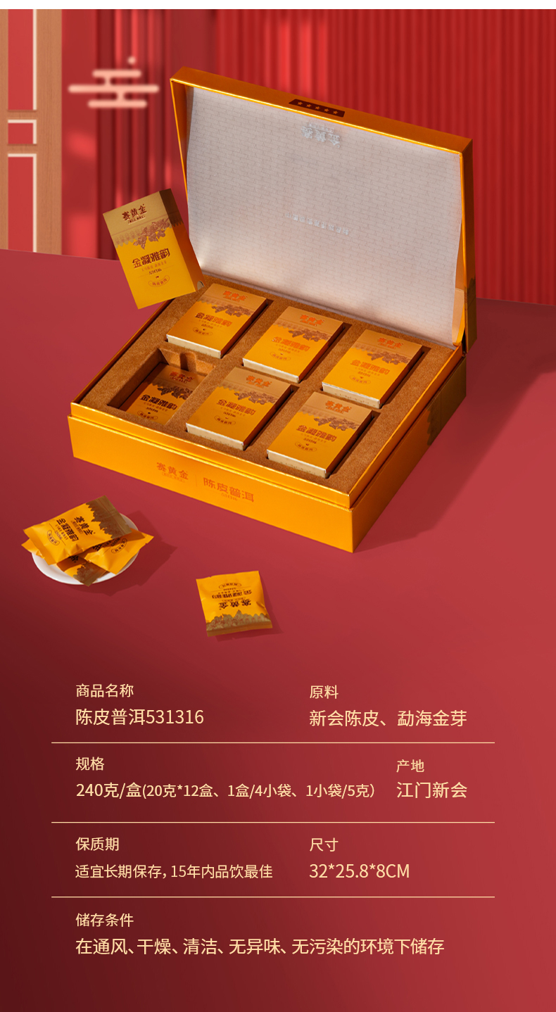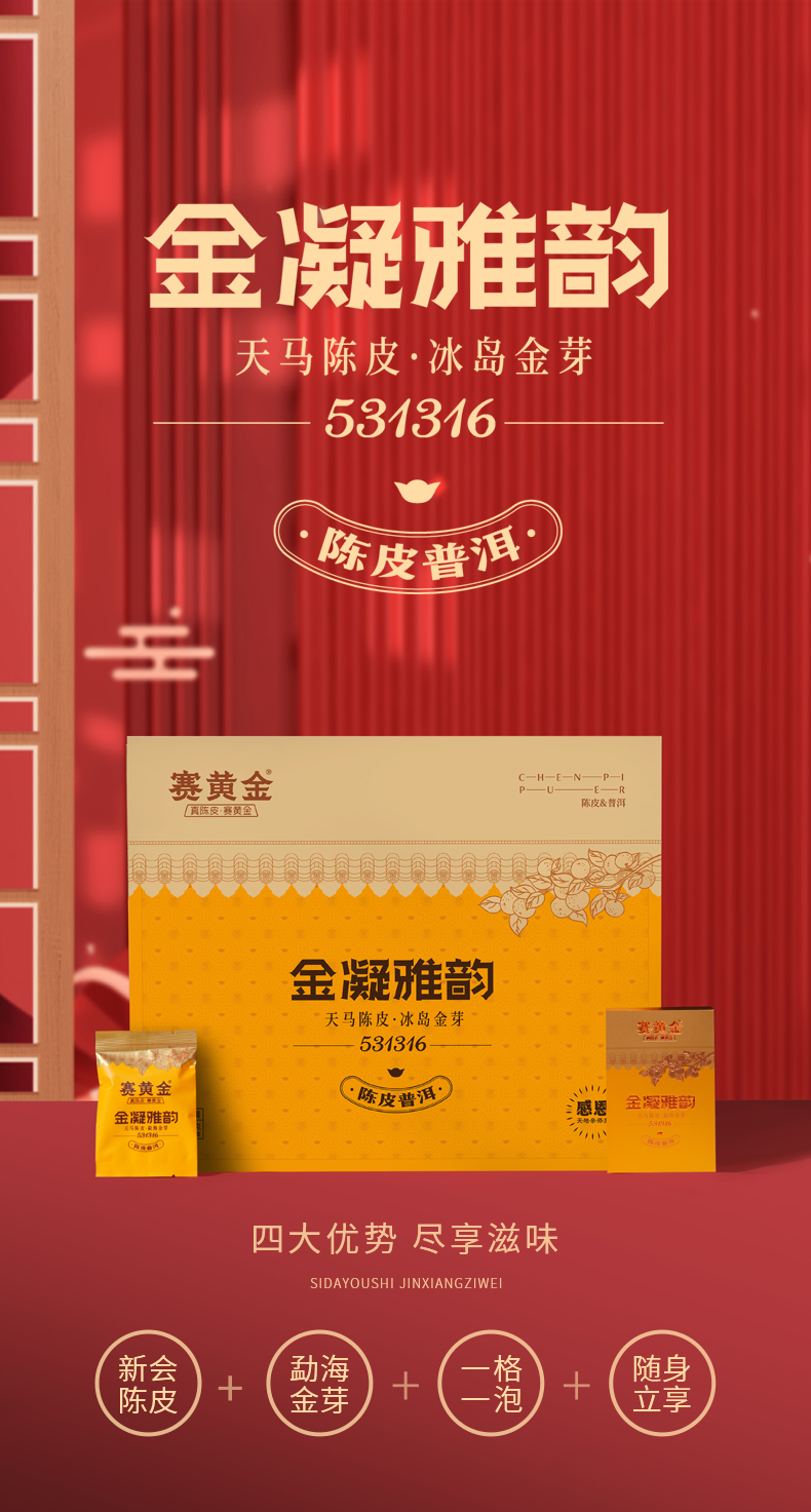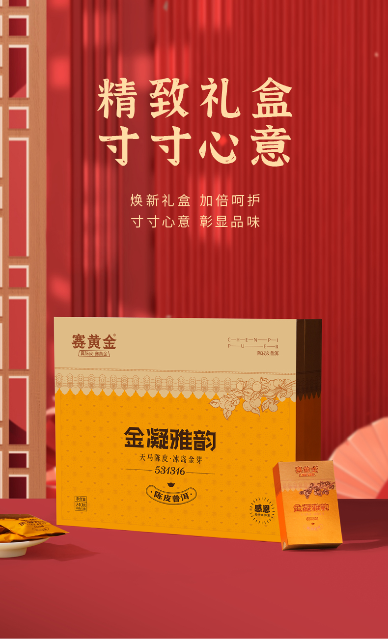 赛黄金旗舰店金凝雅韵新会陈皮普洱茶勐海冰岛金芽熟茶礼盒装240g 玫瑰金