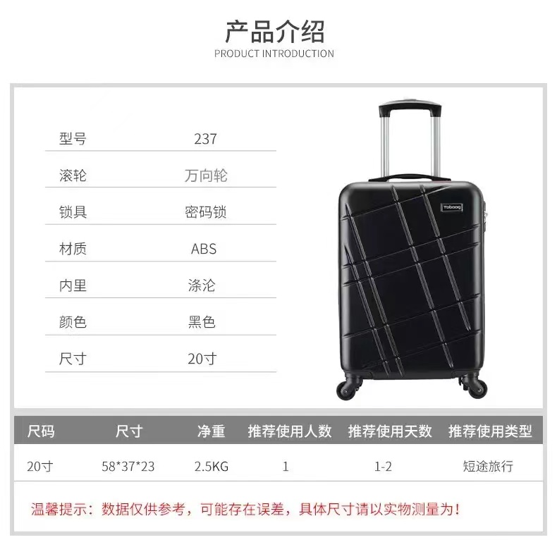 TOBOOG/途帮登机箱万向轮时尚男女拉杆箱上学出游商务旅行箱20寸黑色 237 黑色 20寸
