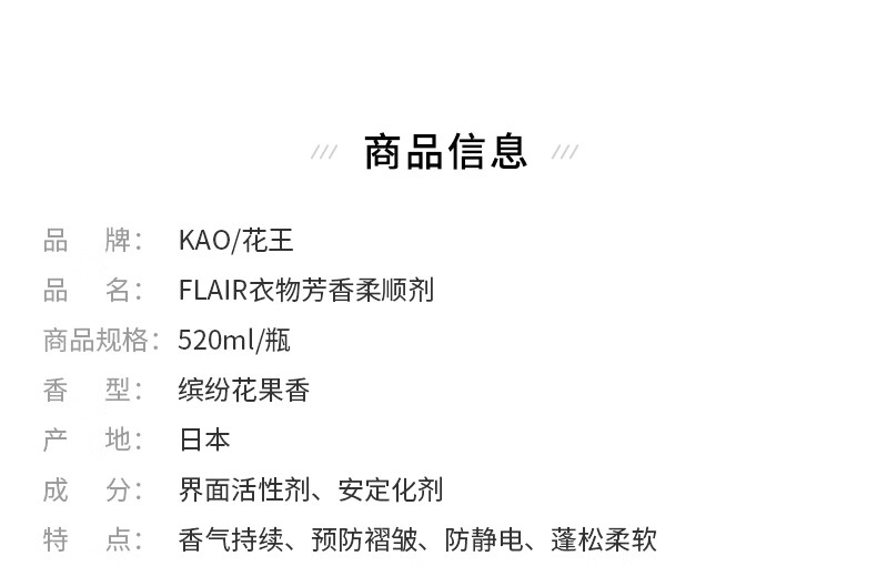 日本进口 花王(KAO) 衣物柔顺剂防静电护理持久留香 520ml(单位:瓶) 蓝色
