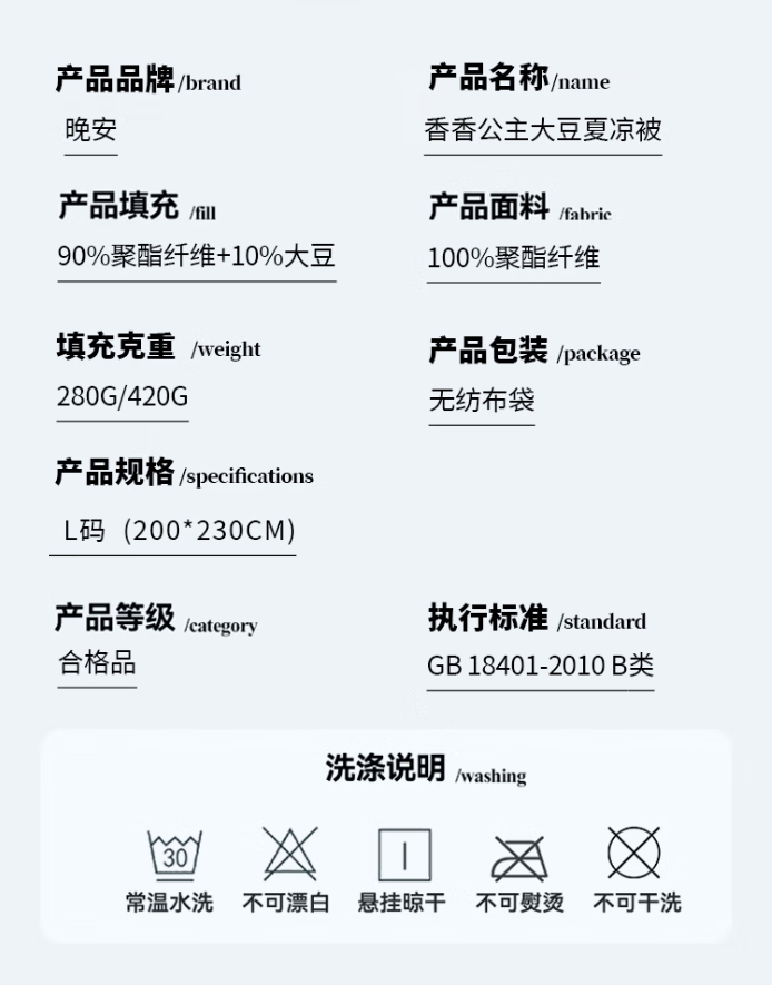 晚安家纺 香香公主 L码200*230cm 香草味抗菌大豆 浅蓝色(单位:床)