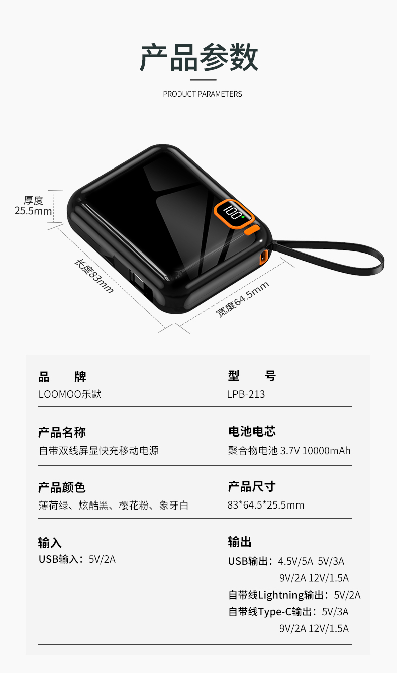 乐默LPB-213自带双线屏显快充移动电源黑色(单位:个)黑色 黑色