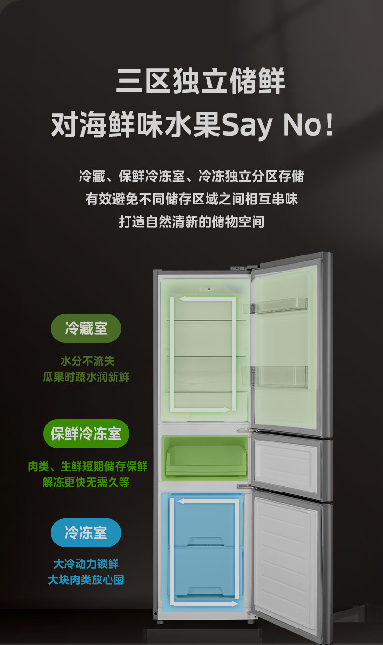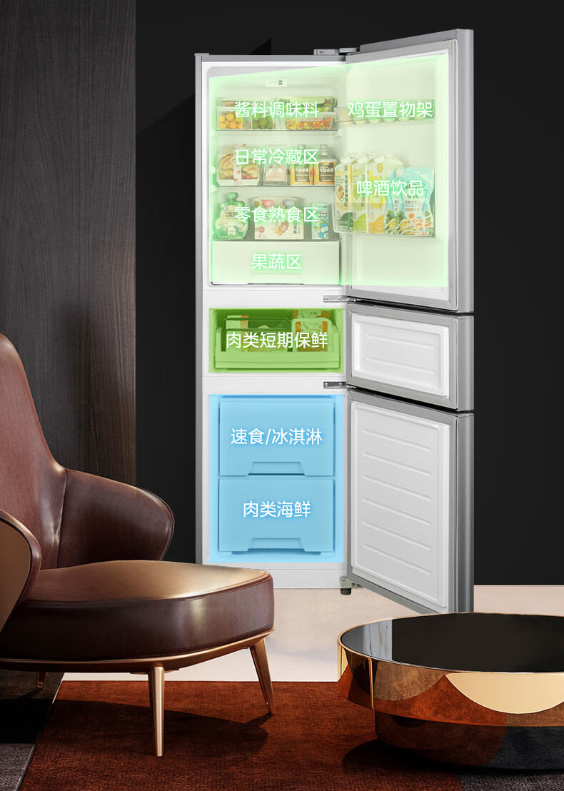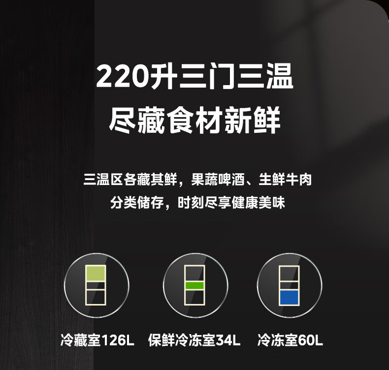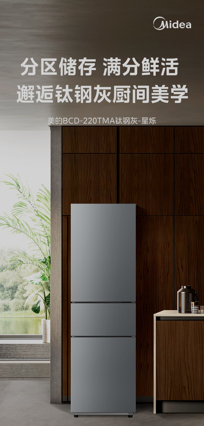 美的(Midea)三门三温 静音净味 租房宿舍小冰箱 220升BCD-220TMA 台 钛钢灰星烁