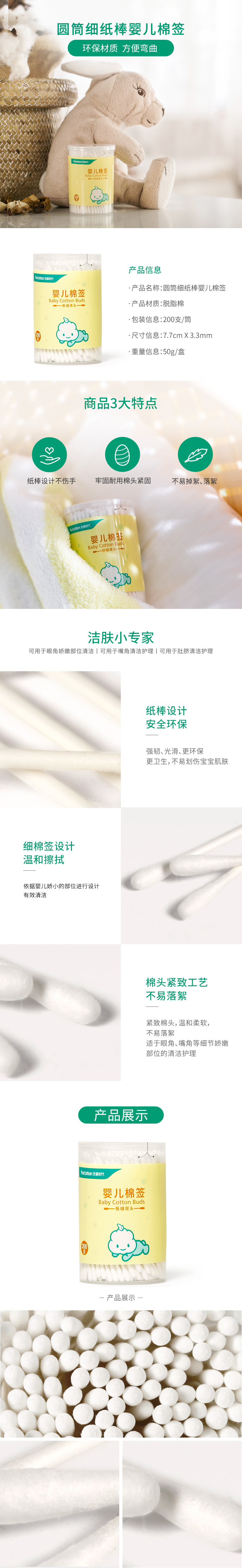 全棉时代圆筒细纸棒婴儿棉签77MMX3.3MM 200支/筒 白色