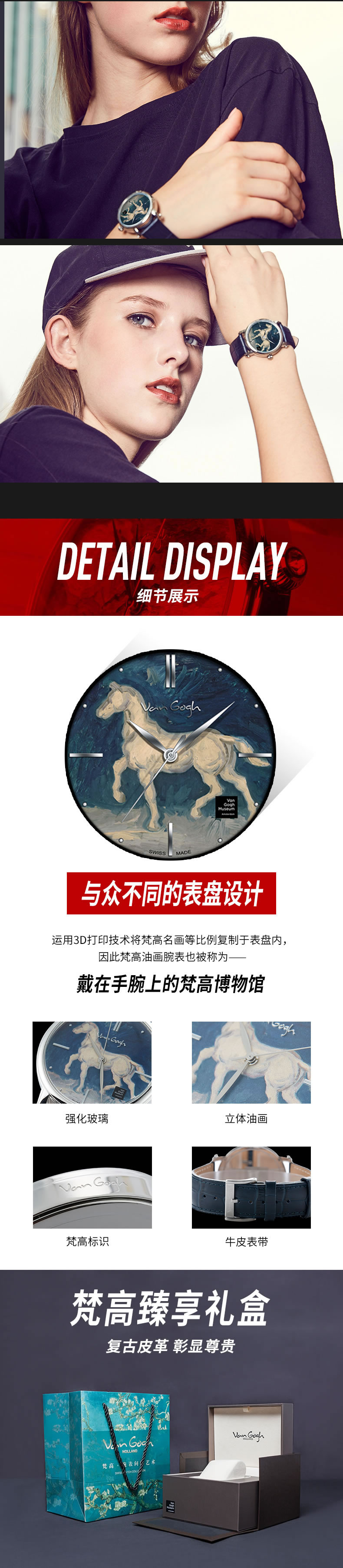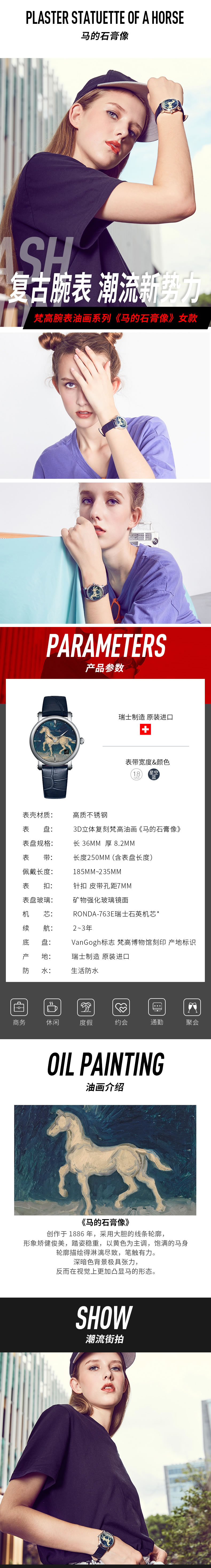 梵高(VanGogh)瑞士手表女 3D油画表面牛皮表带时尚休闲潮牌博物馆正版原装进口 明星同款 马的石膏像 蓝色