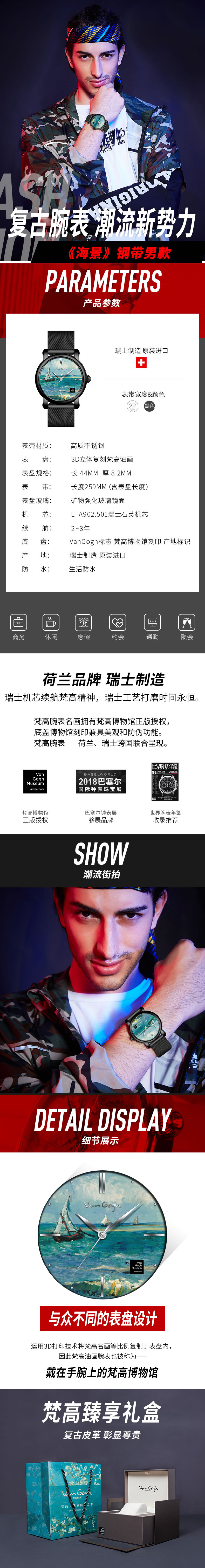 梵高(VanGogh)瑞士手表男 3D油画表面钢带时尚休闲潮牌博物馆正版原装进口 明星同款 海景 黑色