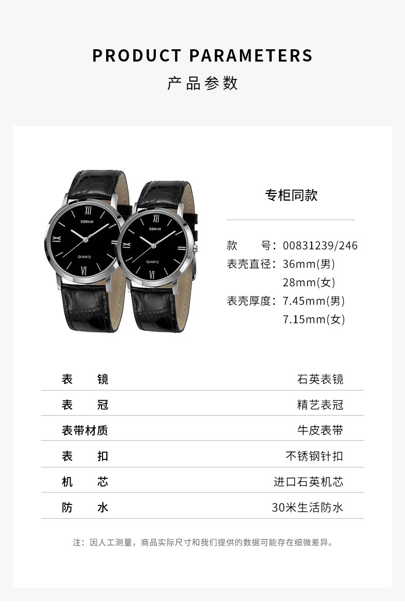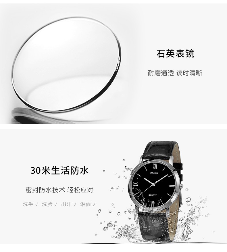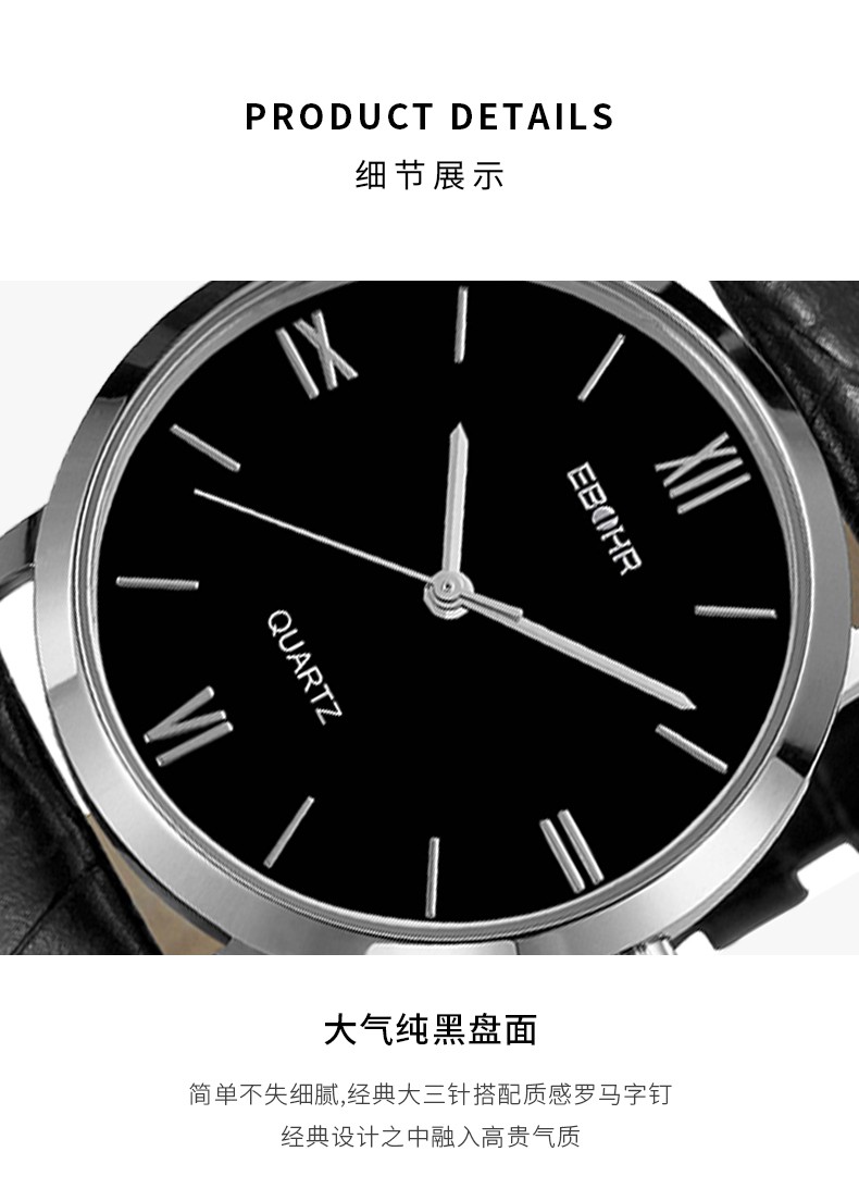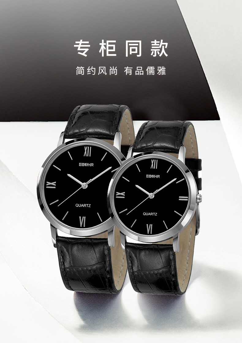 依波(EBOHR)防水手表简约休闲石英皮表带时尚男女对表 黑盘女表 00830246 银壳黑面黑色皮带