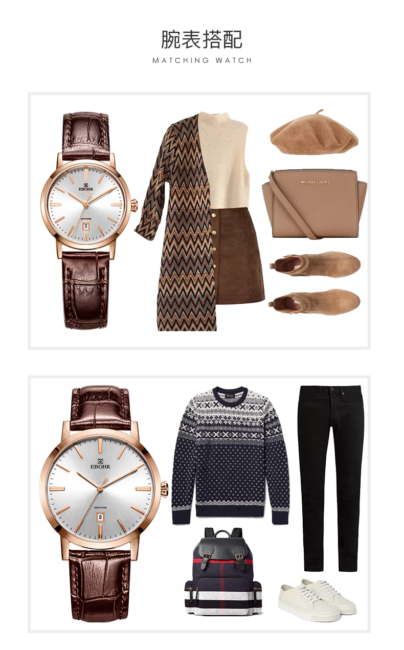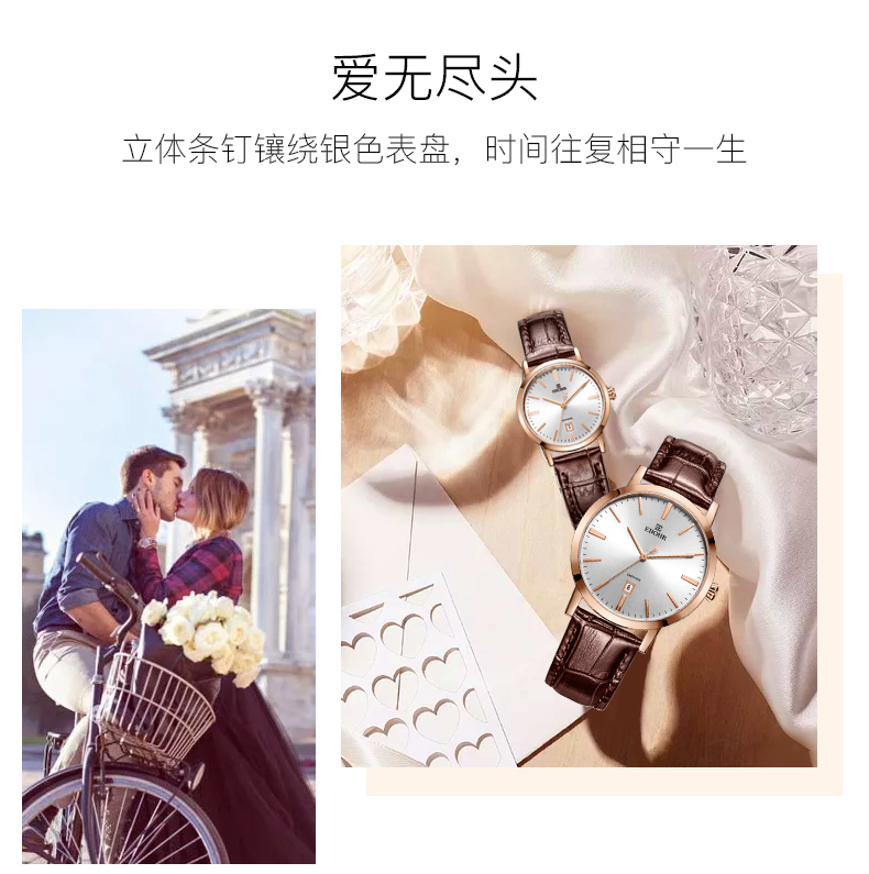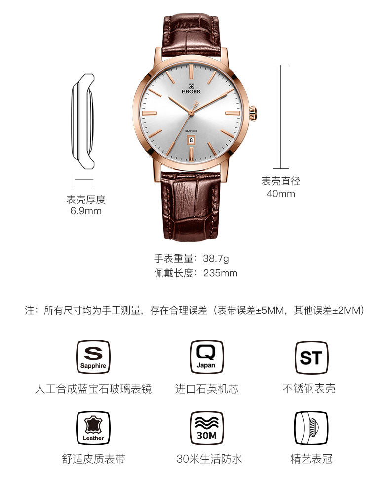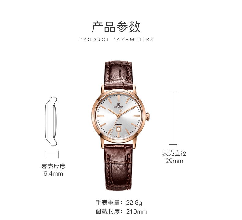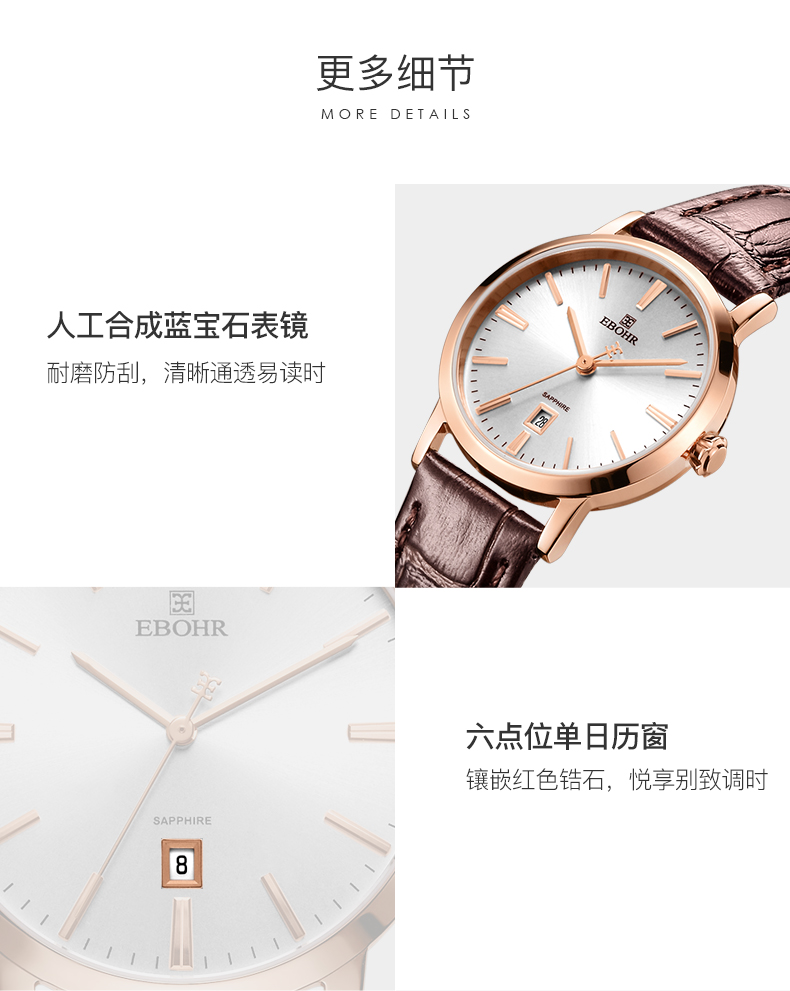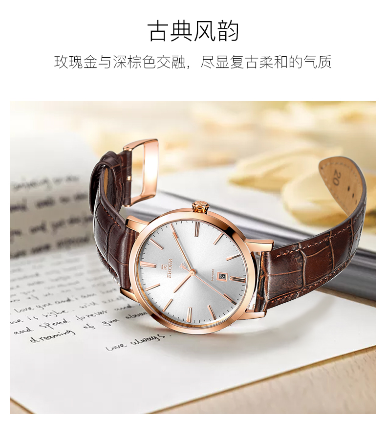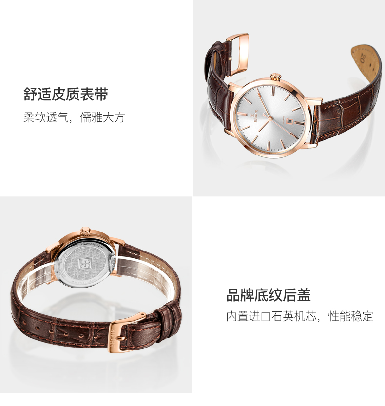 【专柜高品质】依波(EBOHR)专柜同款情侣石英手表男女棕色皮带日历腕表 皮表带女表 10890349 玫壳白面棕色皮带