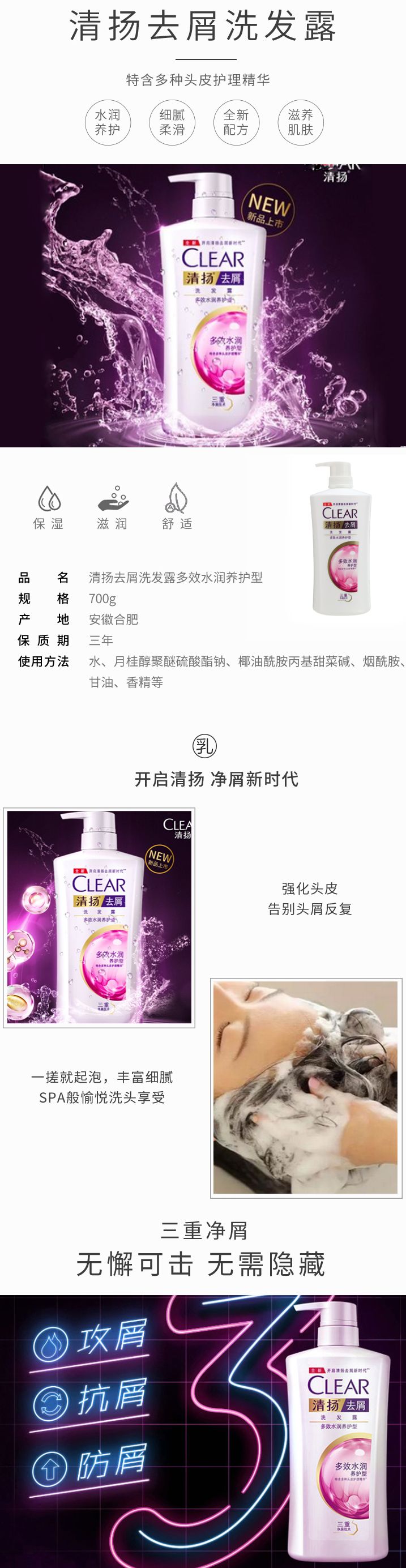 清扬去屑洗发露多效水润养护型700G 单位:瓶 混色