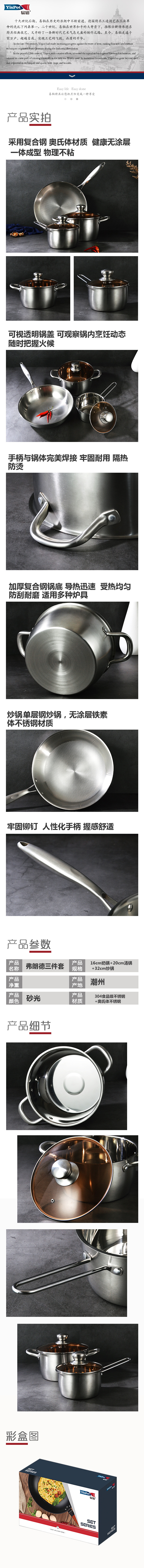 【yispot易铂】诺尔恰三件套锅YP-9007奥氏体不锈钢32cm炒锅+20cm汤锅+16cm奶锅 不锈钢色