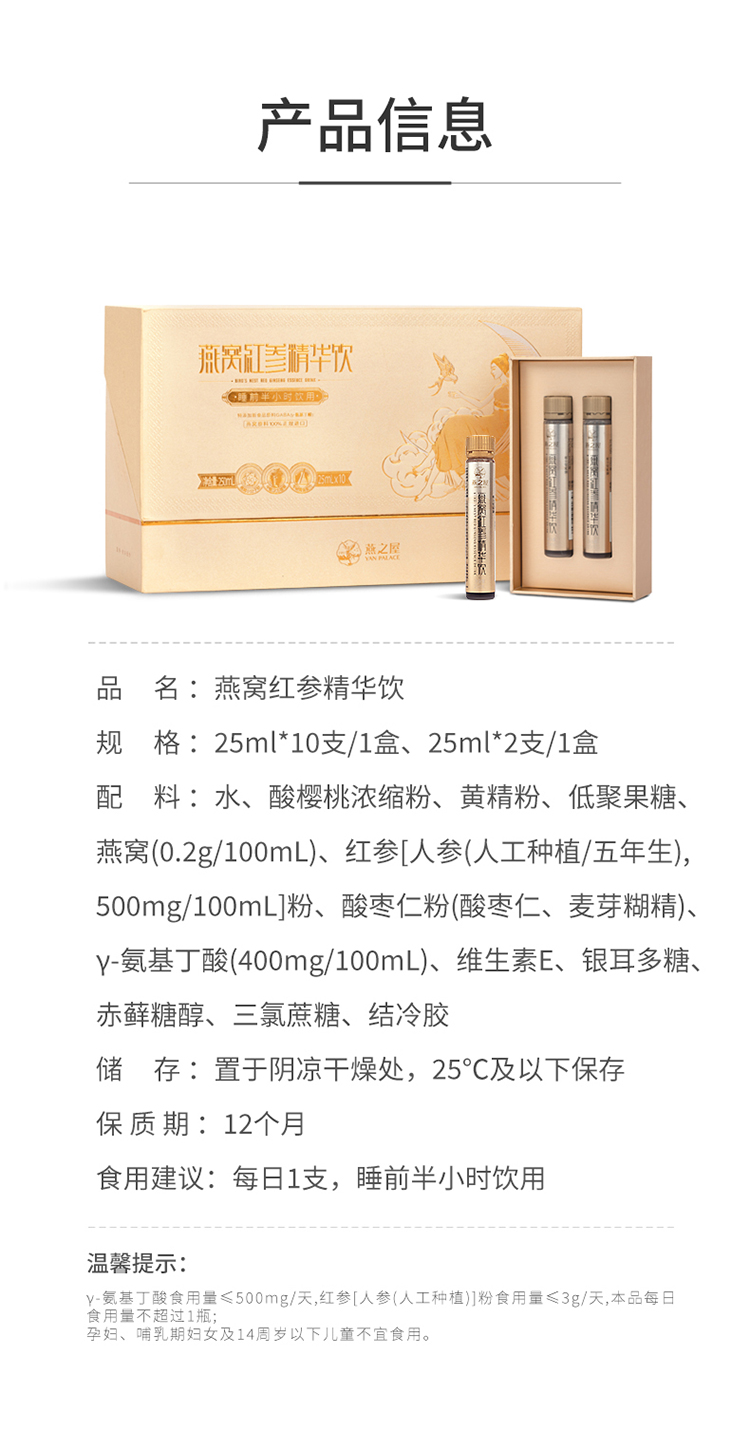 燕之屋 燕窝红参精华饮 25ml*10支 礼盒装 香槟黄(单位:盒)