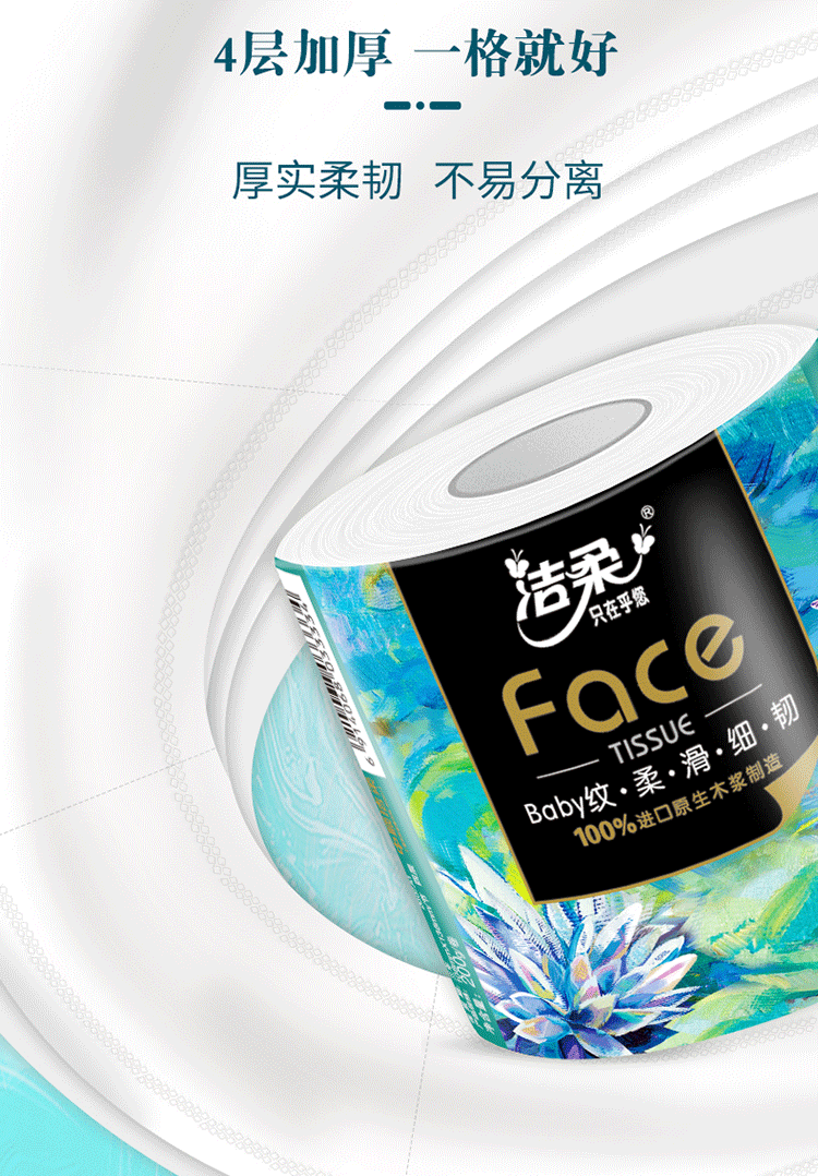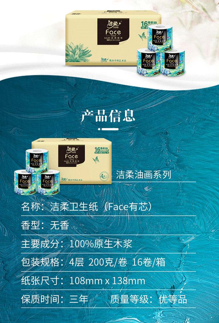 洁柔卫生纸Face油画有芯卷纸加厚200g 4层 16卷整箱装BJ203-16E 白色