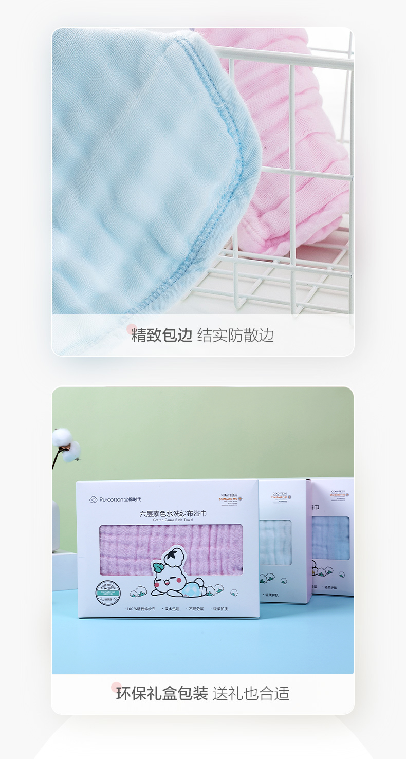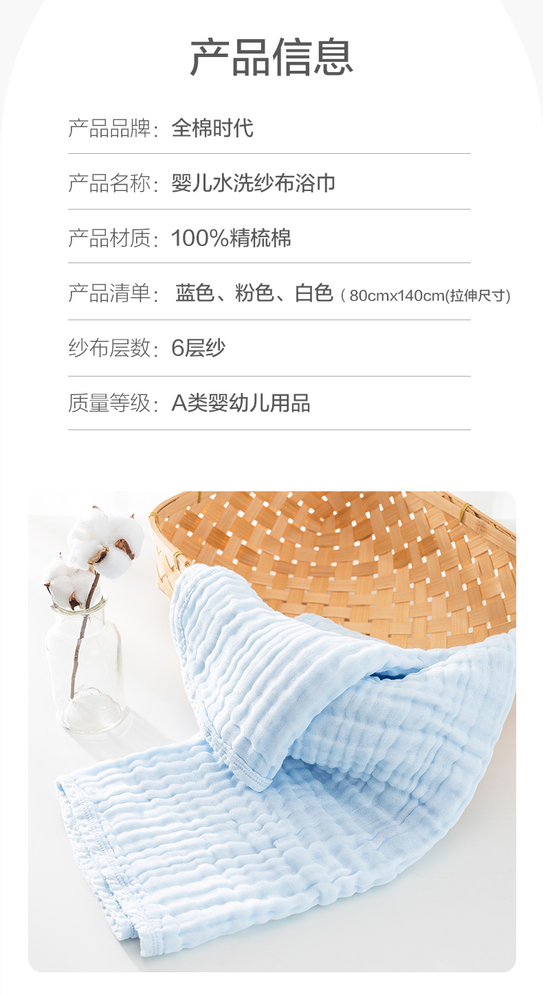 全棉时代蓝色包边款水洗纱布浴巾80x140-6P 1条/盒 婴儿蓝