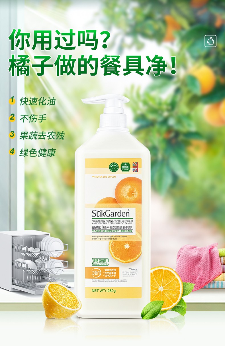 蔬果园洗洁精果蔬清洗剂去油不伤手洗涤灵除菌食品用级餐具净1.28kg