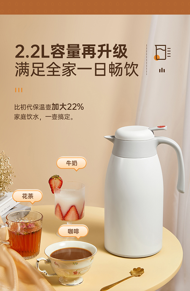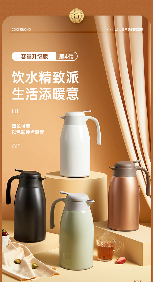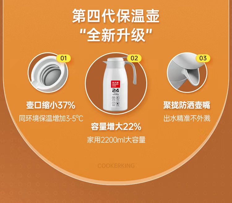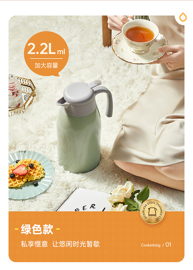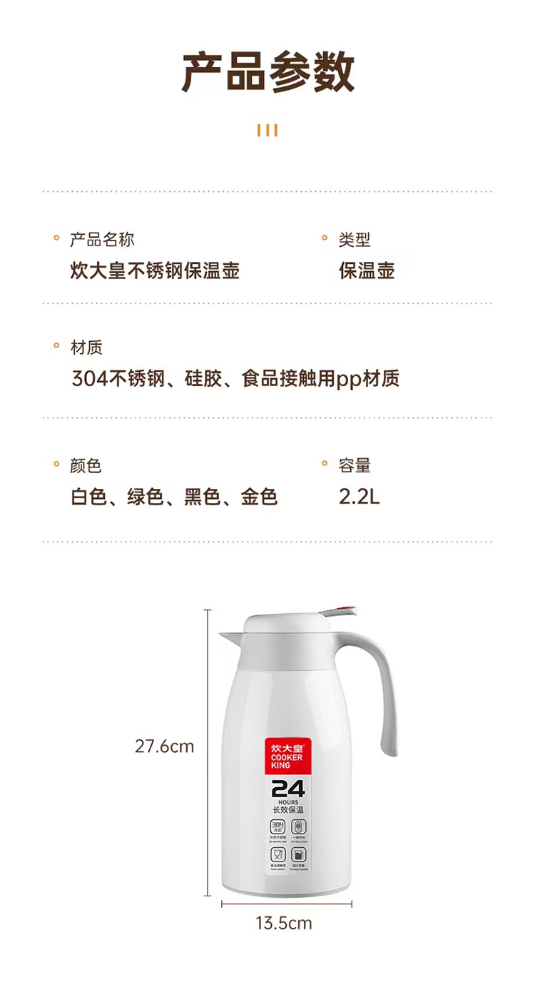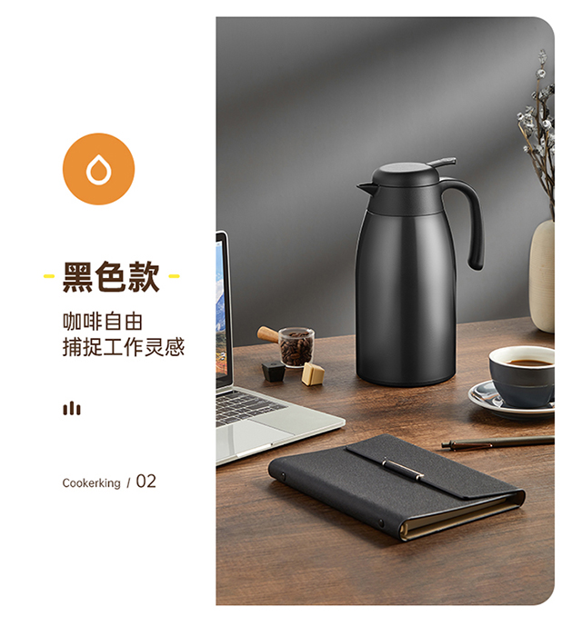 炊大皇(COOKER KING) 保温壶 内304不锈钢真空保温防烫大容量家用办公暖水壶2.2L 个 雅黑色