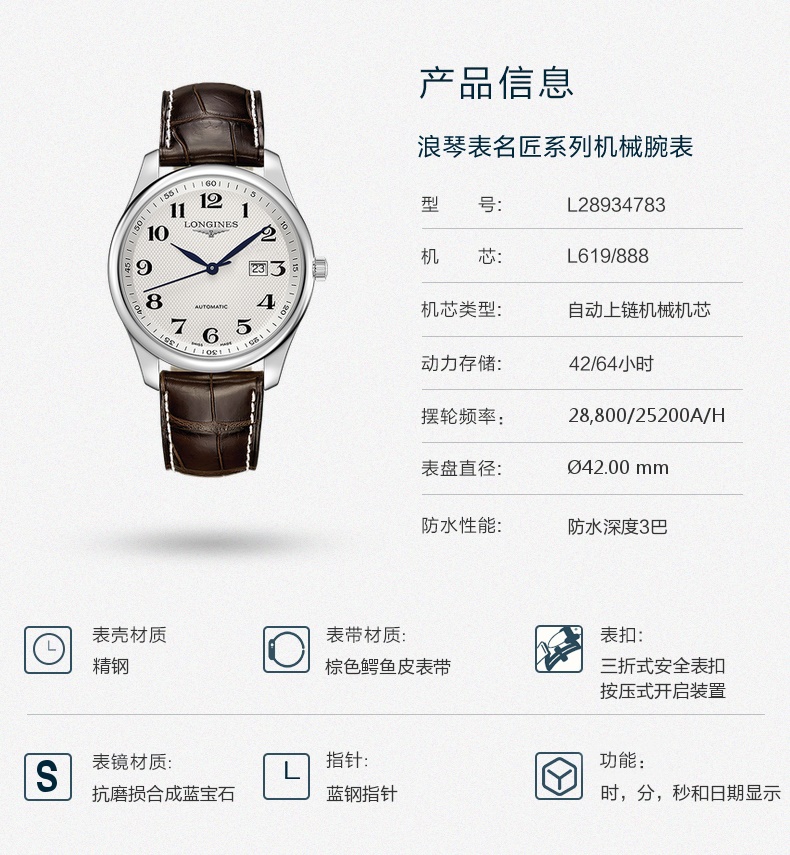 Longines浪琴名匠系列机械手表腕表皮带男表(42mm) L2.893.4.78.3 单位:块 白色