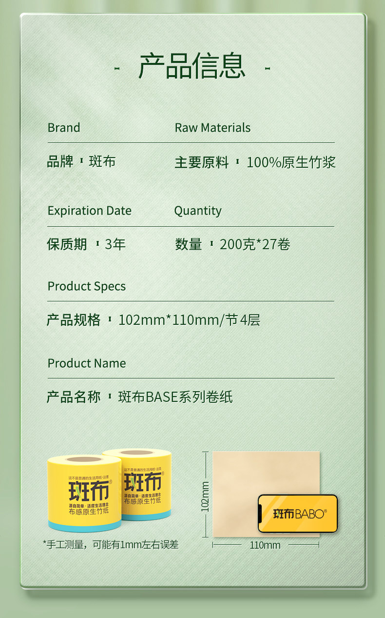 斑布BASE系列有芯有膜卷纸200g*27卷装DBCJ200A27(单位:箱) 黄色