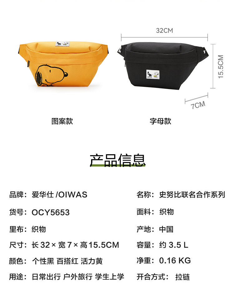 爱华仕(OIWAS) OCY5653 32*7*15.5cm 休闲潮流腰包 黄色(单位:个)