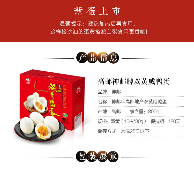 神邮双黄咸鸭蛋 熟10只x80g 800g/盒单位:盒 红色