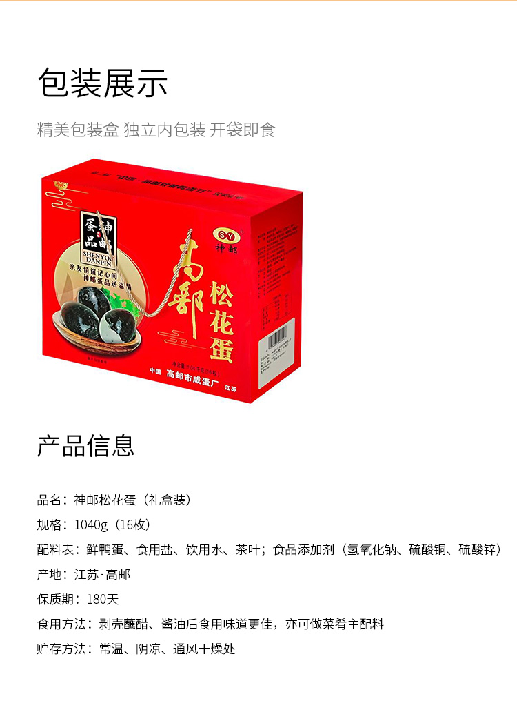 神邮 高邮松花蛋皮蛋 熟16枚*65g单位:盒 红色