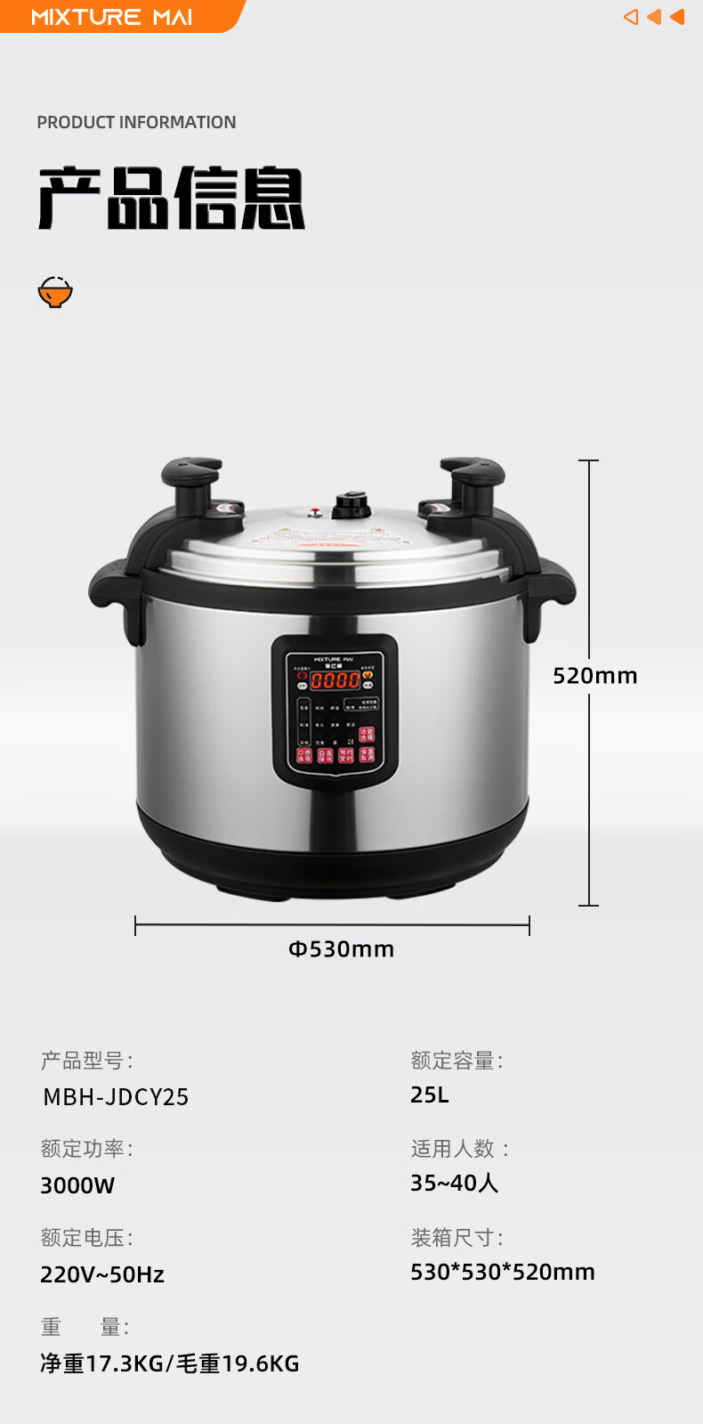 脉巴赫 商用电压力锅 多功能煲汤熬粥煮饭电高压锅25L MBH-JDCY25 白色