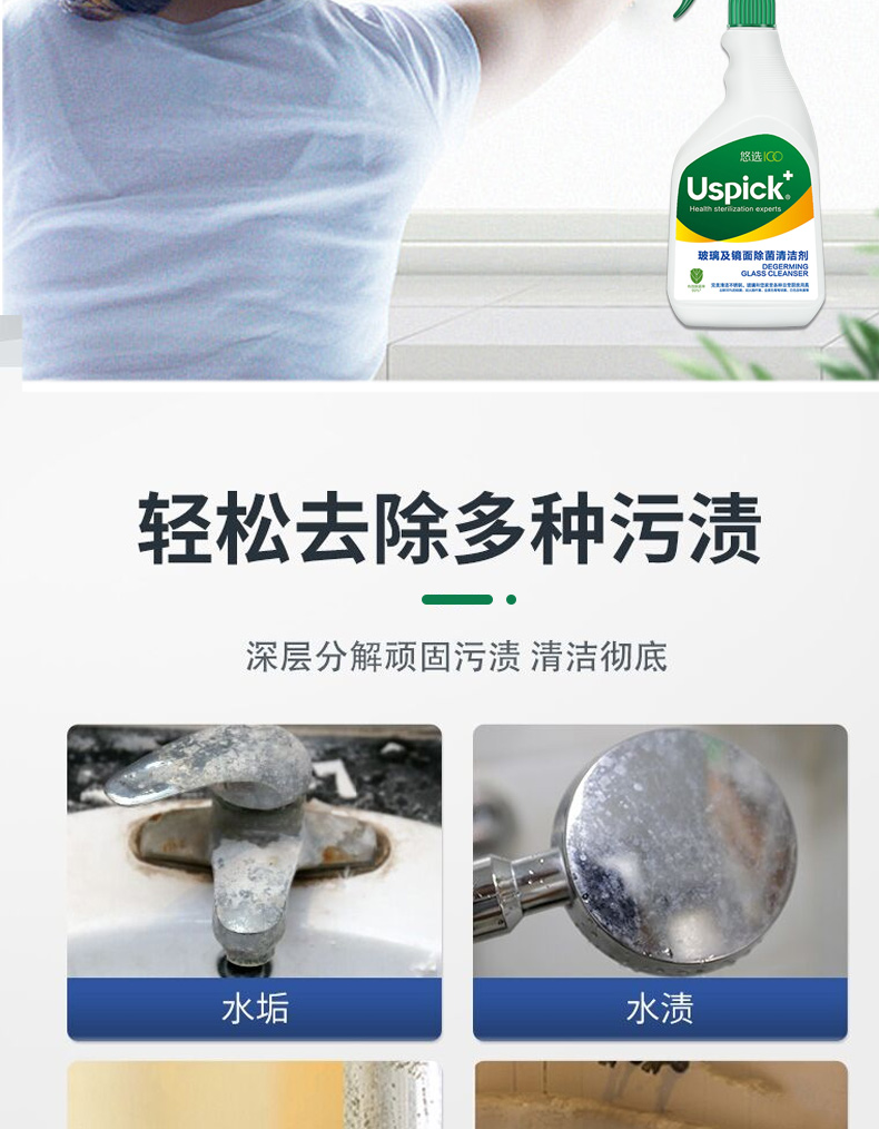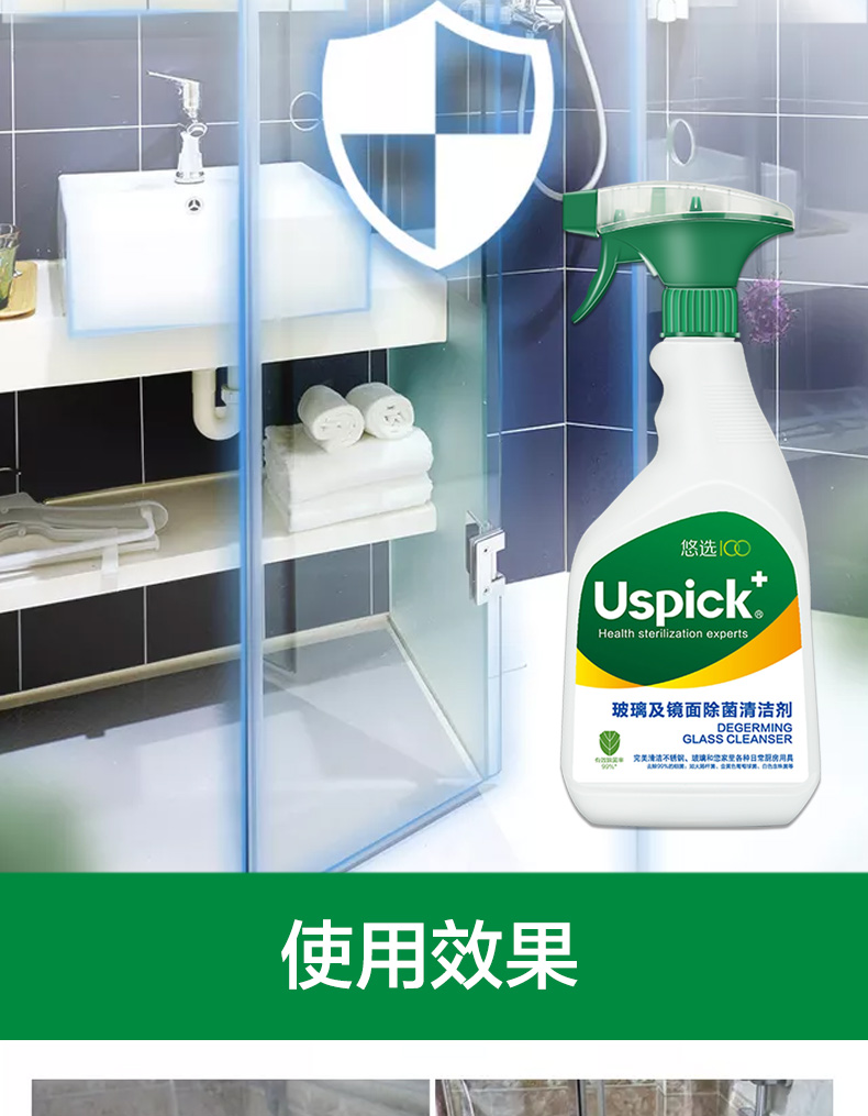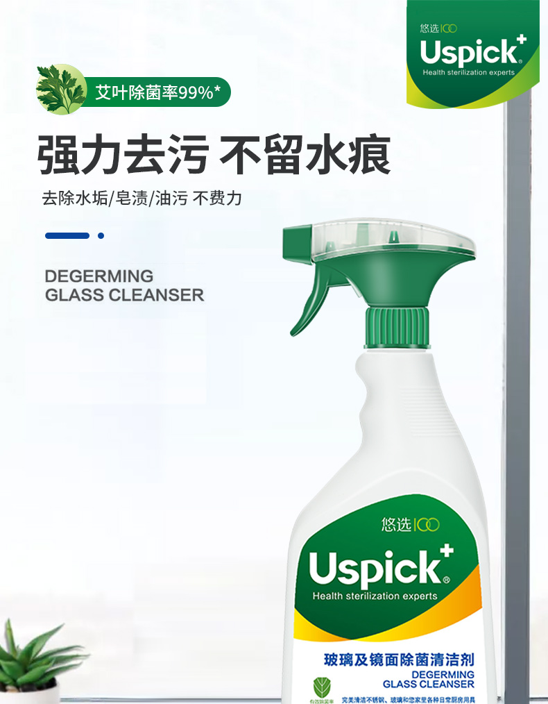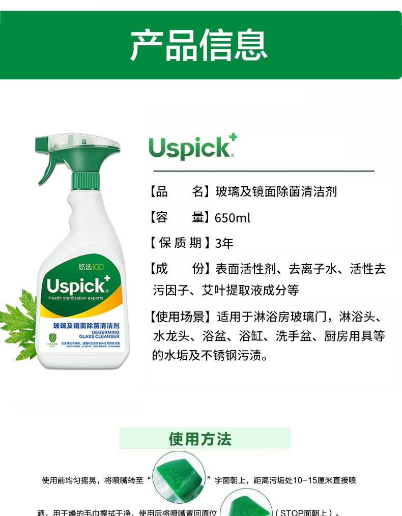 悠选Uspich+玻璃及镜面除菌清洁剂650ml/瓶 灰绿色