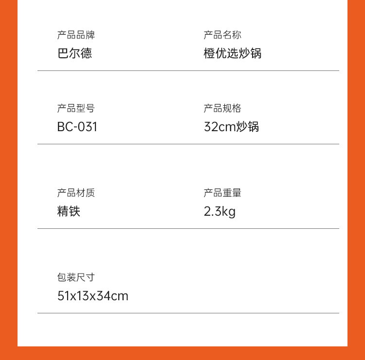 巴尔德 橙优选炒锅(复底) BC-031(单位:套) 橙色