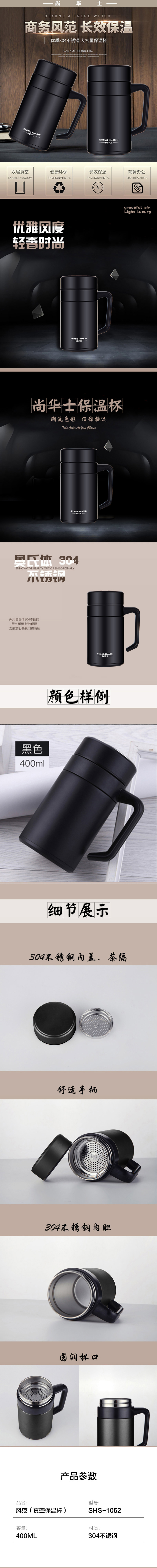 尚华士(SHANG HUASHI) 风范真空保温杯 SHS-1052 400ML 黑色(单位:个)