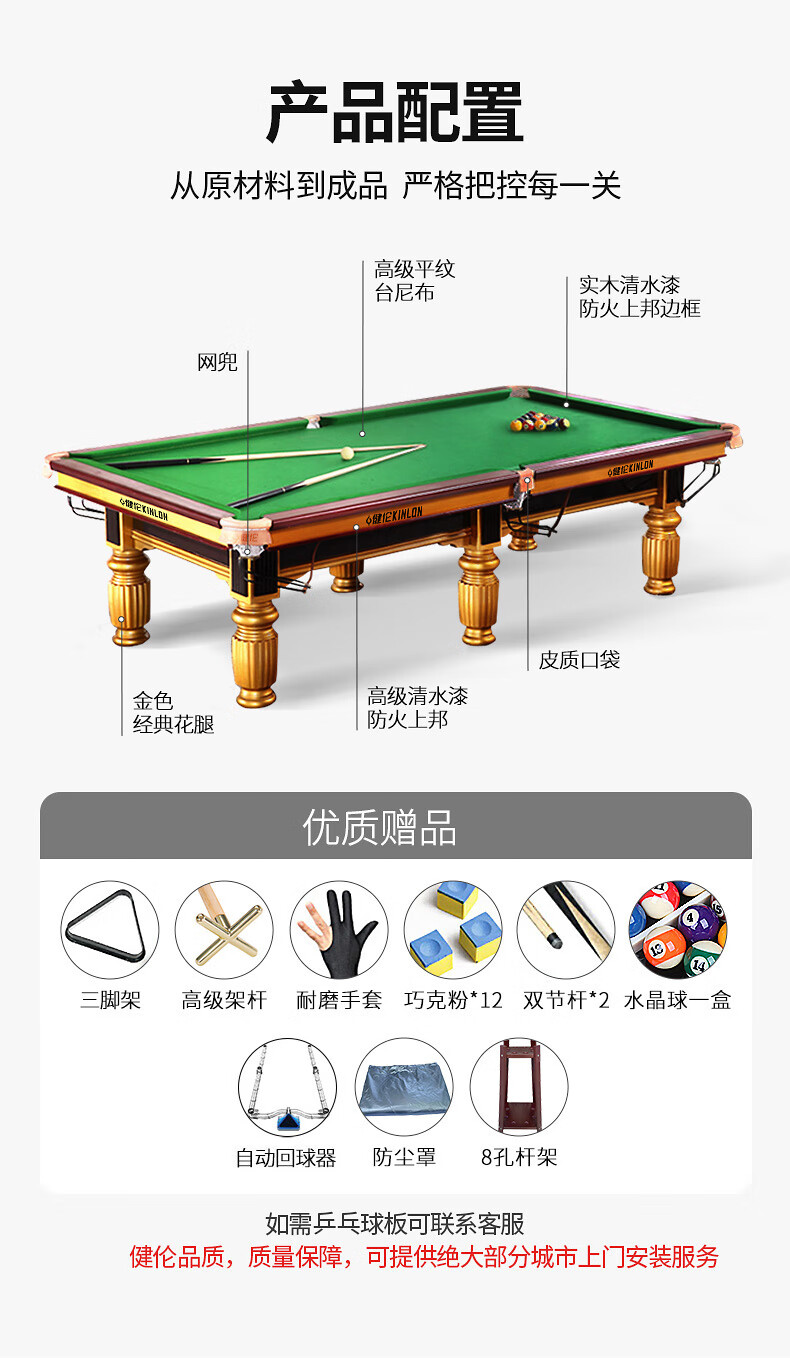 健伦(JEEANLEAN)JL-ZQT12台球桌标准成人桌球家用黑八美式落袋案中式顶配版 军绿色