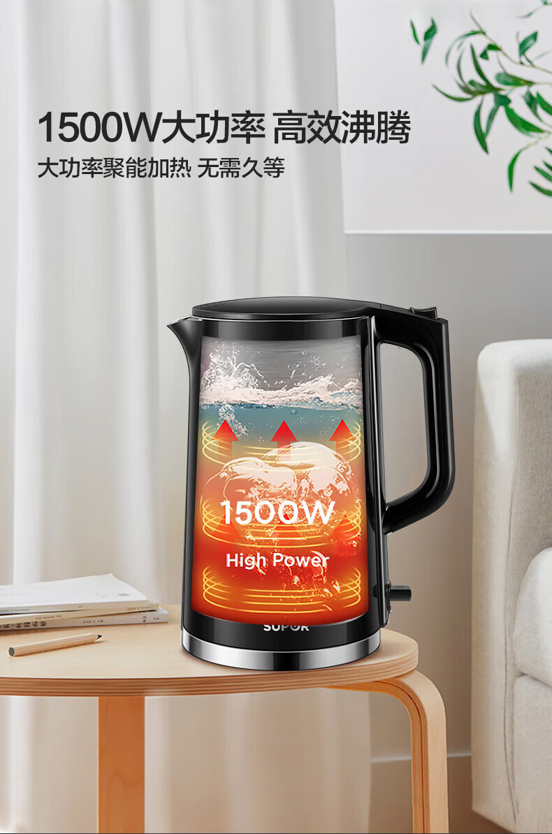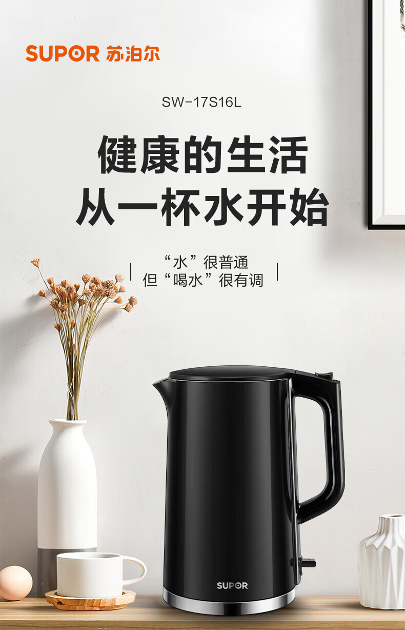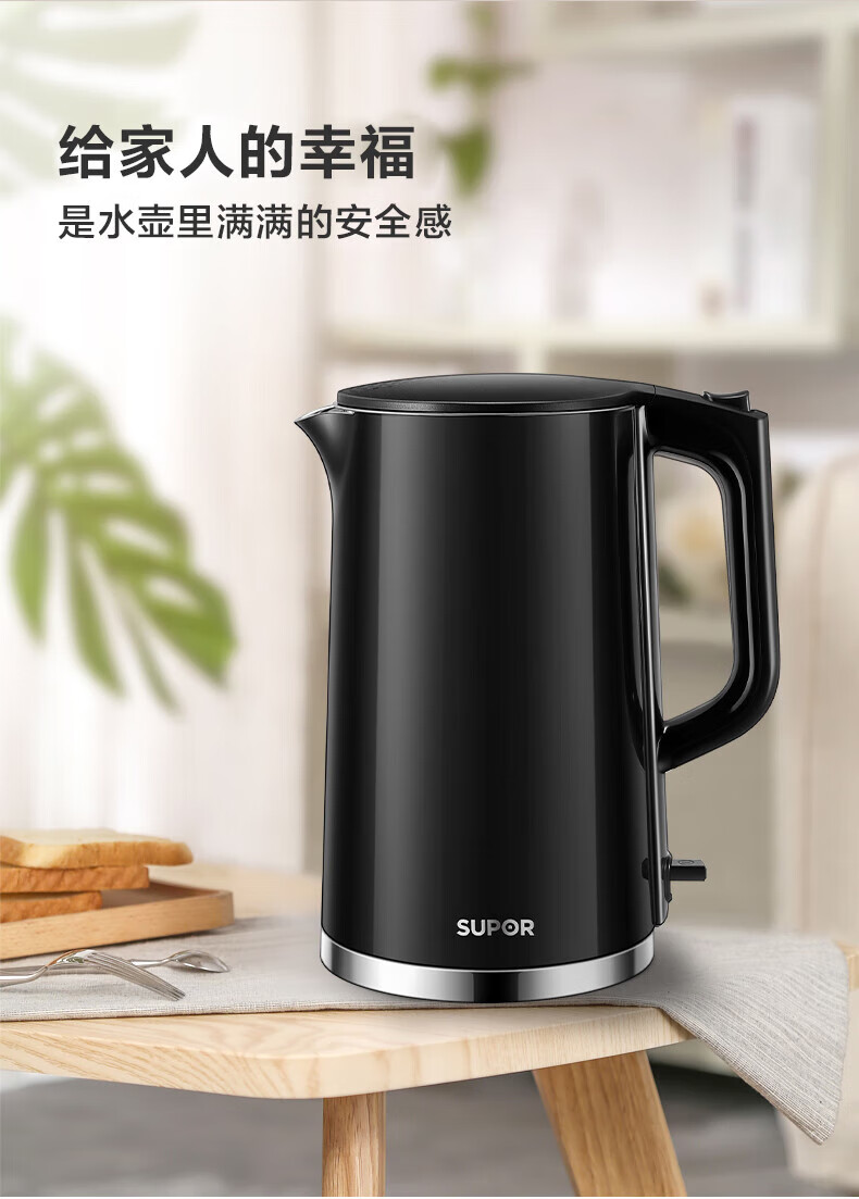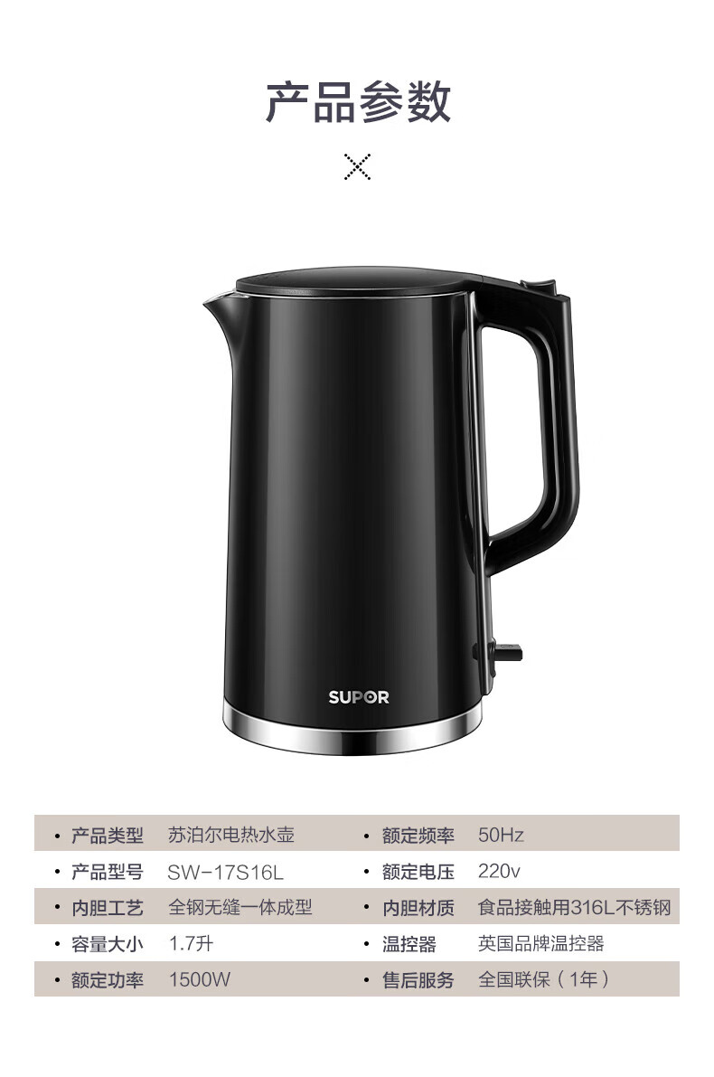 苏泊尔(SUPOR)1.7L电水壶双层保温1500W大功率 SW-17S16L/台 黑色