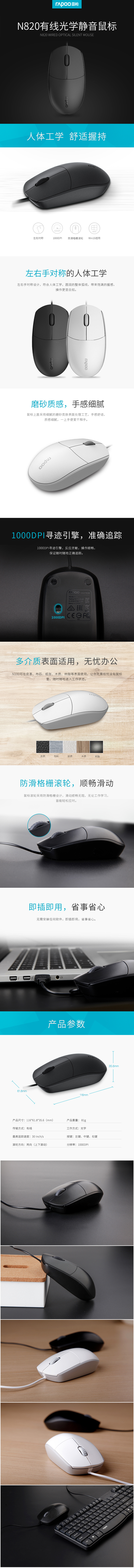 雷柏N820有线静音鼠标 USB笔记本台式电脑鼠标线长1.5米 黑色