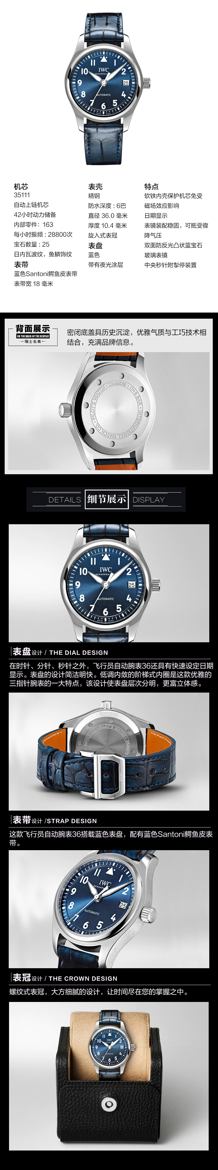 IWC万国 飞行员系列自动机械手女士腕表(36mm) IW324008(单位:只) 蓝色