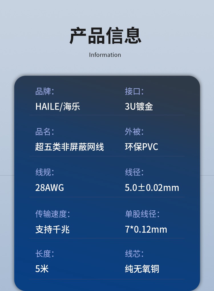 海乐(Haile)超五类网线 网络跳线 HT-220H-5M 无氧铜线芯 非屏蔽 线缆 黑色5米 黑色