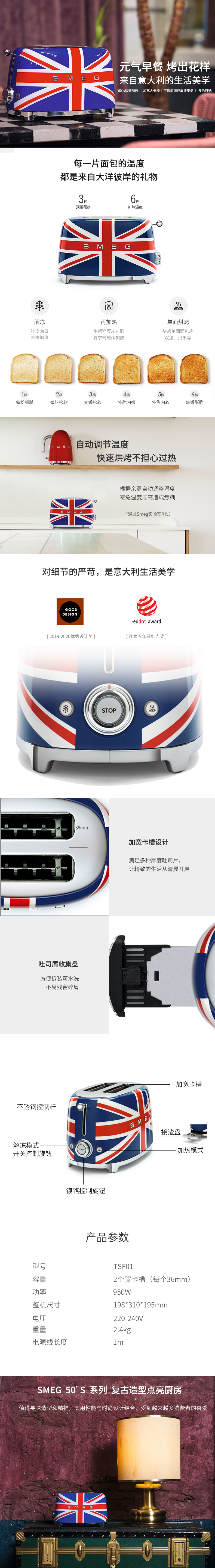 SMEG斯麦格 意大利 复古烤面包机吐司机多士炉 TSF01 (单位:台) 米字旗