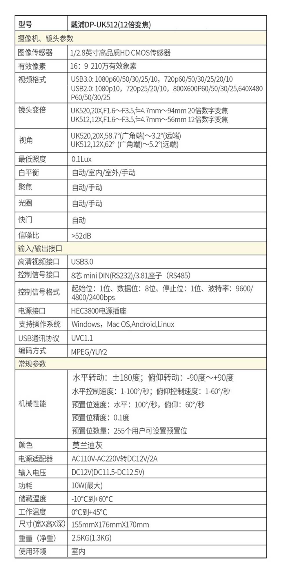戴浦视频会议摄像头高清视频会议广角摄像头腾讯会议视频会议设备系统12倍变焦自动聚焦DP-UK512 黑色
