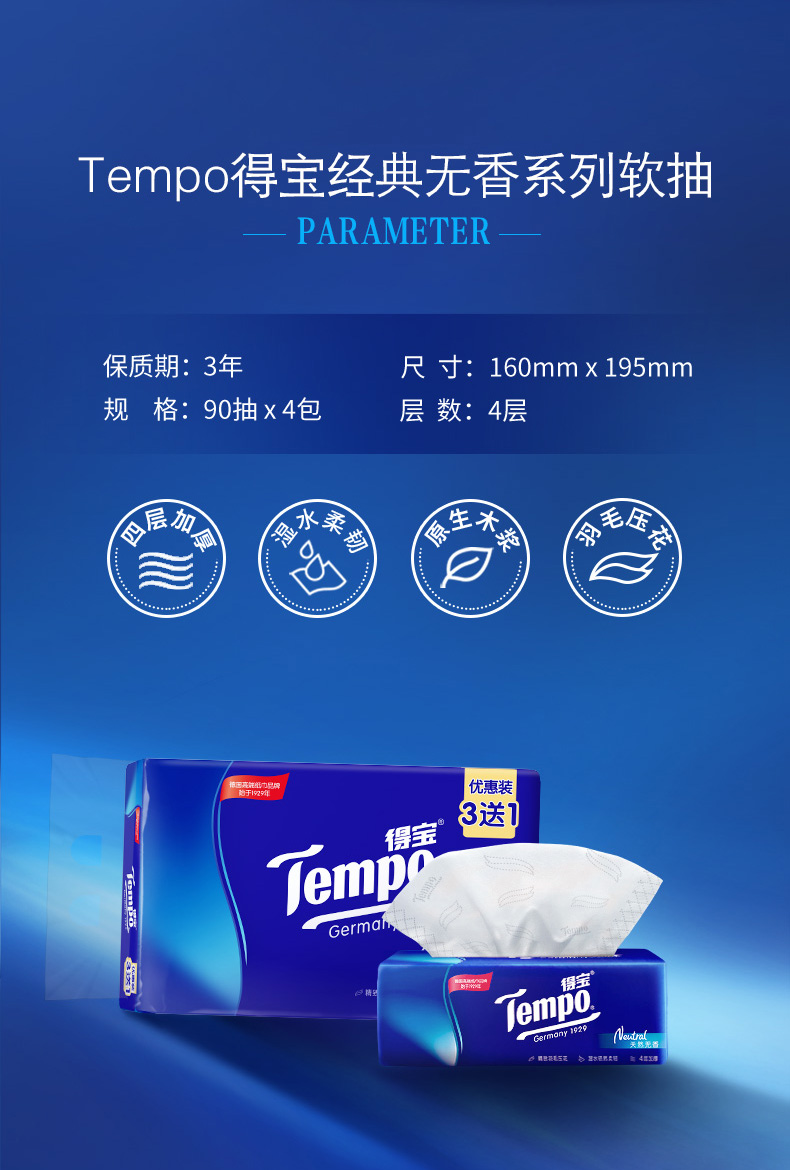 得宝 T2275-04E-T 无香 抽纸4层90抽4包 白色(单位:包)