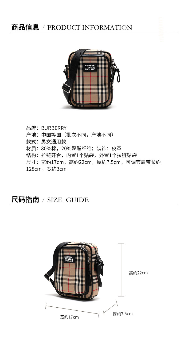 Burberry 博柏利男女通用米色织物配皮单肩包 Z11100370200(单位:个) 卡其色