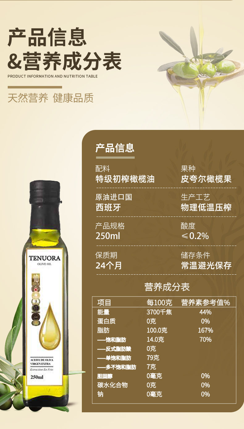 特诺娜特级初榨橄榄油250ML*2瓶 象牙色