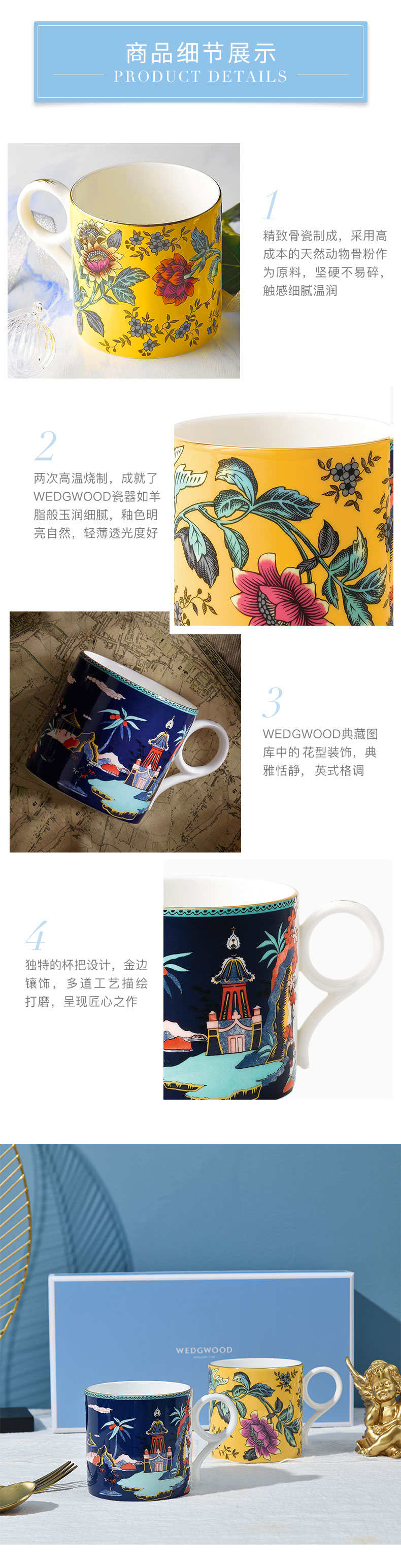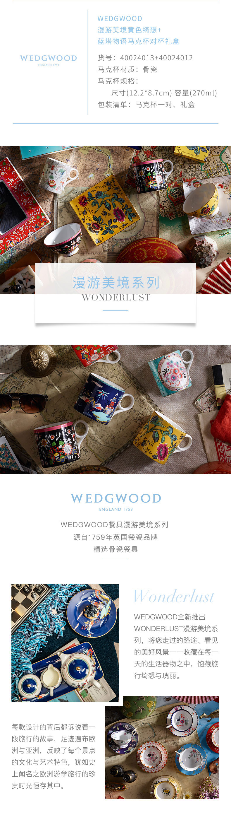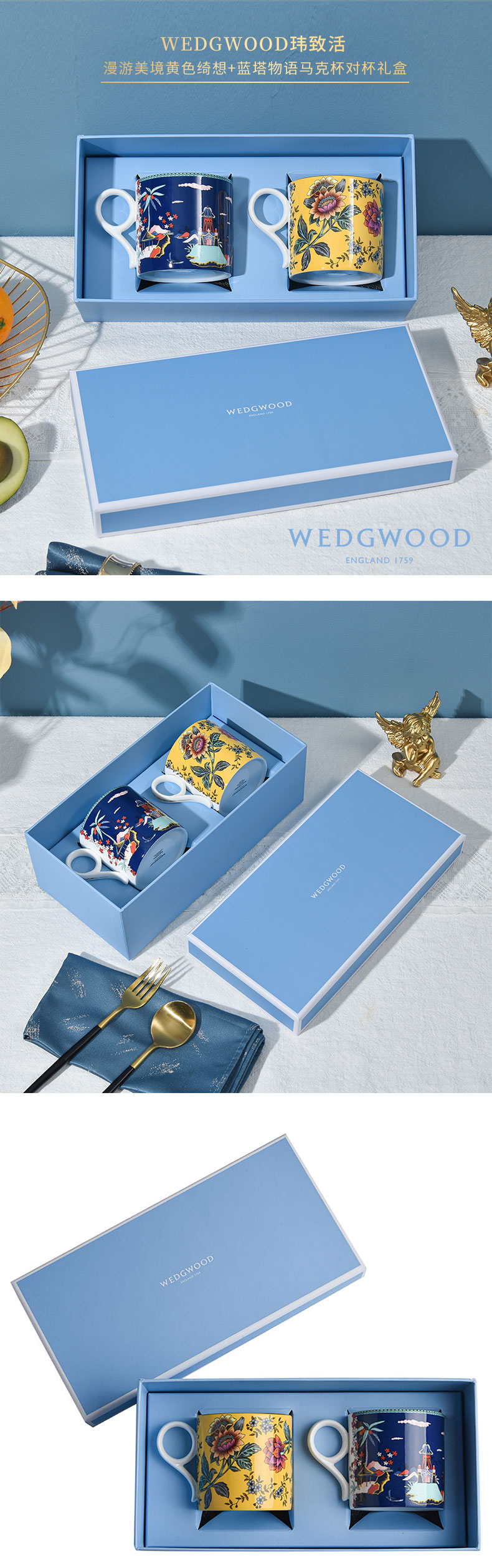 WEDGWOOD 威基伍德40024013+40024012(单位:套) 漫游美境黄色绮想+蓝塔物语马克杯对杯礼盒
