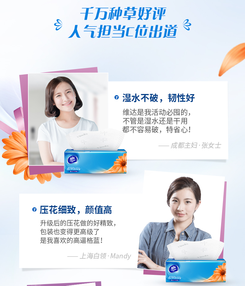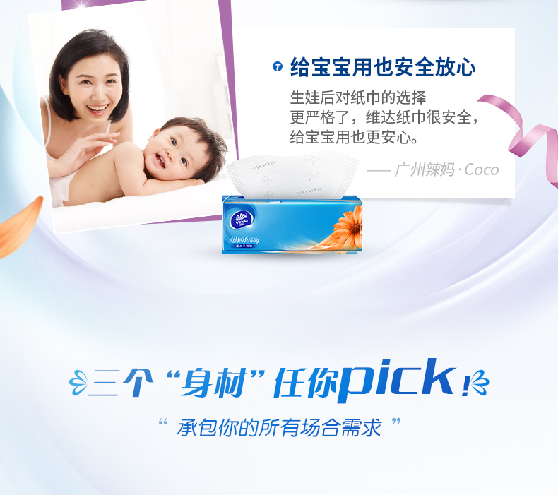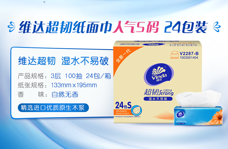 维达家庭装超韧抽取面巾 3层S码100抽×24包S(整箱装) 宝石蓝