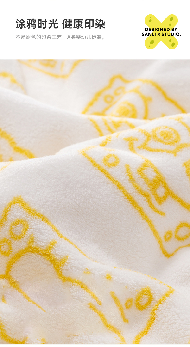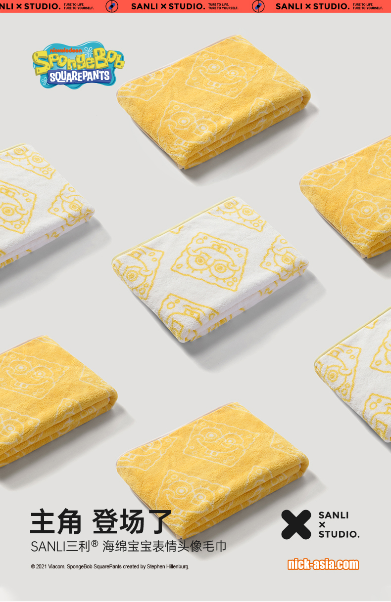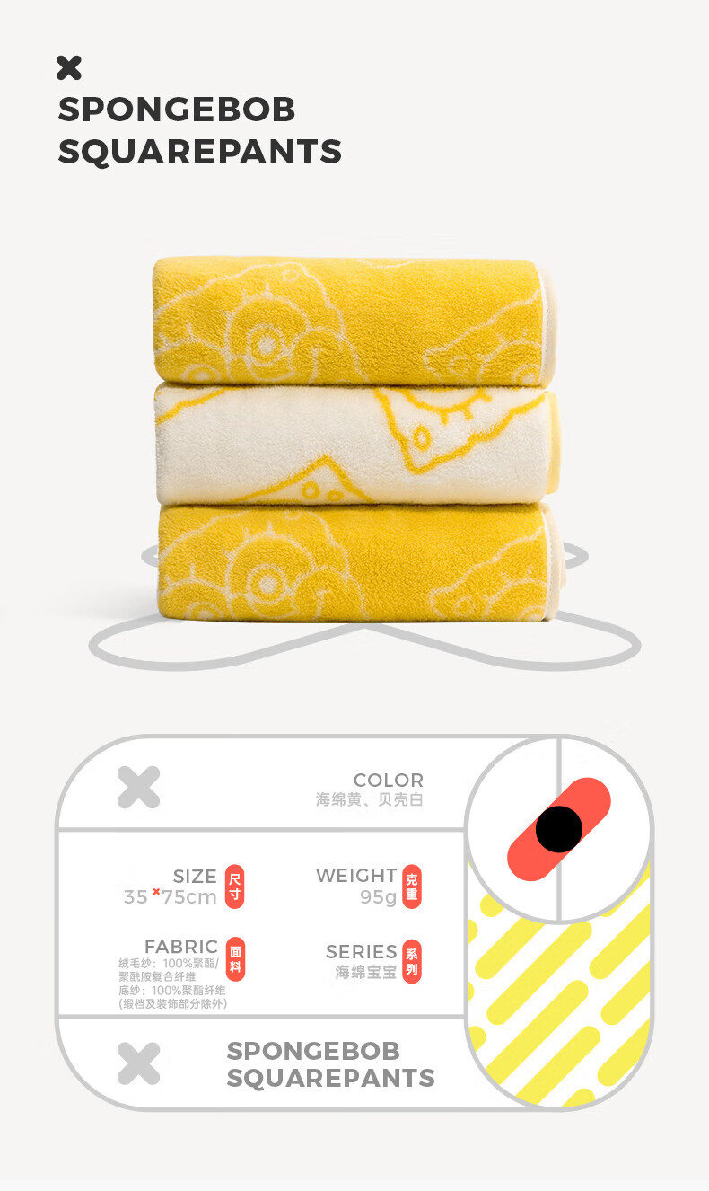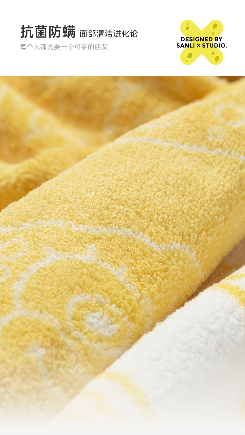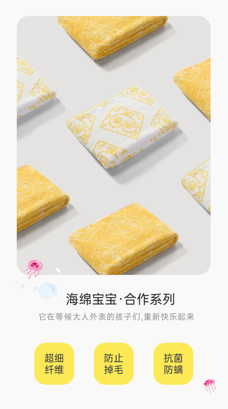 三利 BOB8010 海绵宝宝抗菌毛巾2条家用吸水速干不易掉毛面巾 海绵黄+贝壳白 单位:套 混色