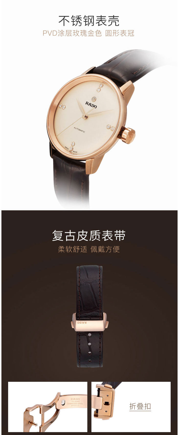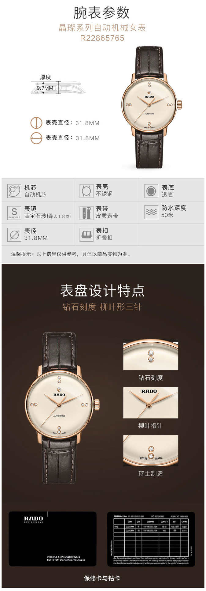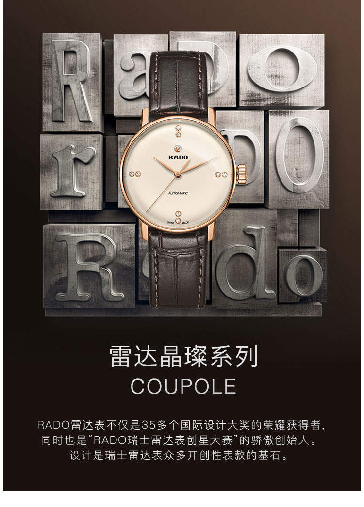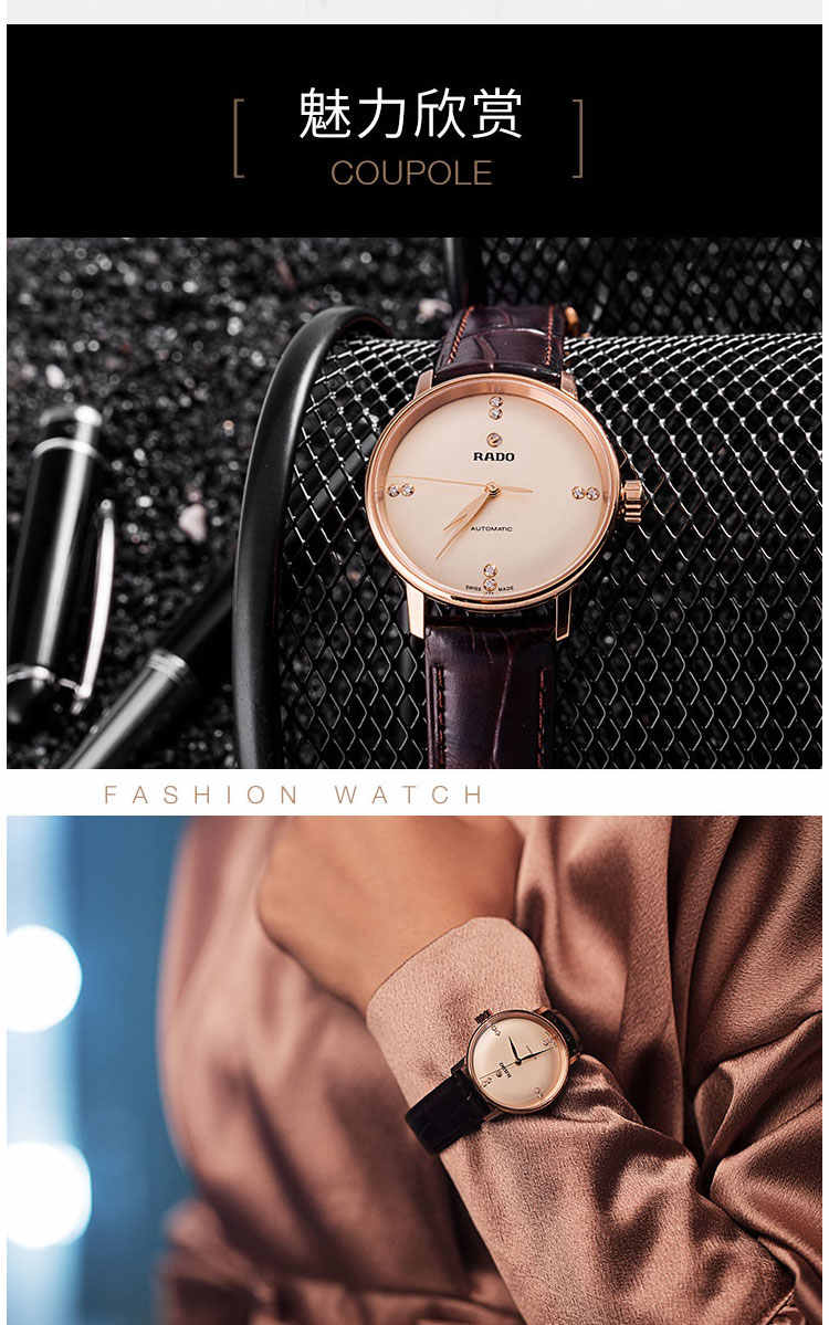 RADO雷达手表 晶璨系列女士皮质表带情侣机械钻表 R22865765 单位:块 金色