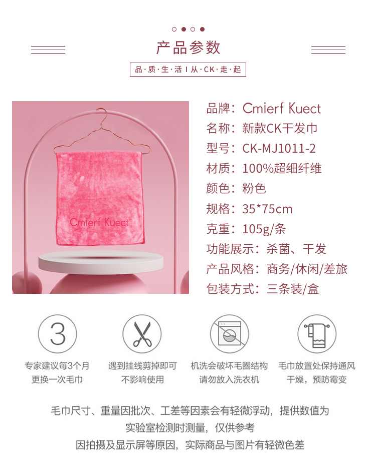 Cmierf Kuect (中国CKIR)新款CK干发巾 CK-MJ1011-2单位:盒 粉色