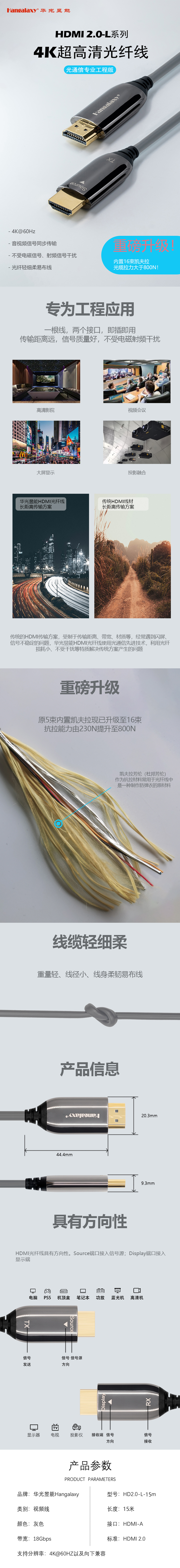 Hangalaxy华光昱能HDMI2.0-4K-L系列光纤线-工程/投影/大屏/电脑连接 单位:条 灰色15米