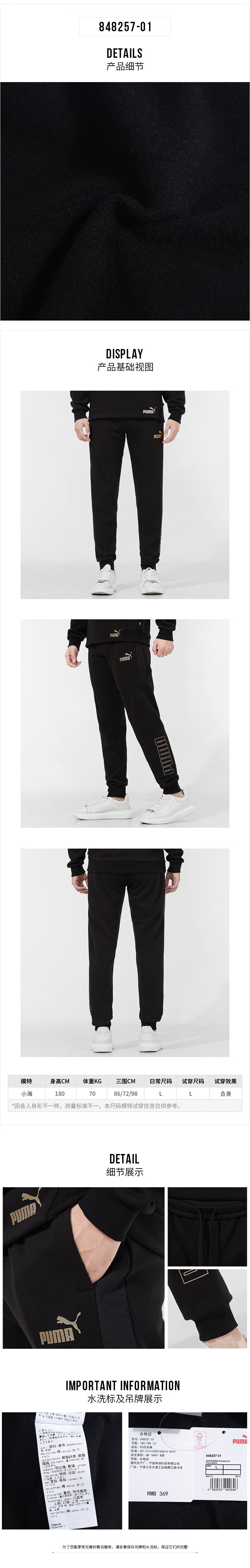 彪马(PUMA)男裤 秋冬新款户外运动裤时尚透气保暖舒适休闲长裤 848257-01 黑色 2XL