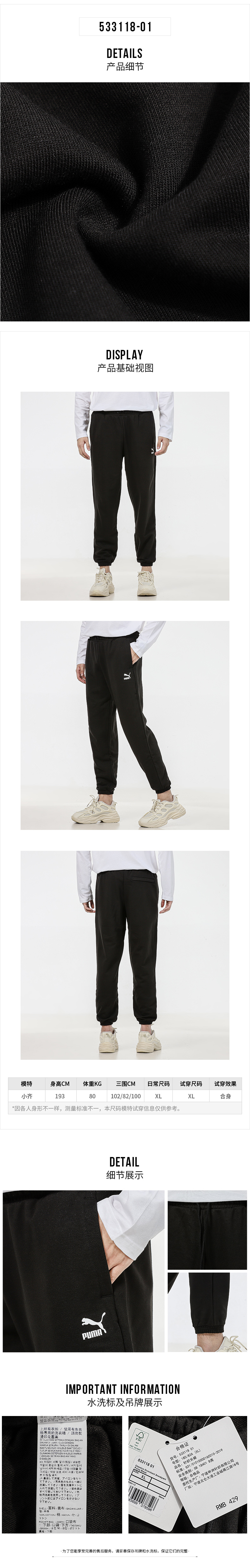 彪马(PUMA)男裤 新款透气跑步束脚运动裤舒适时尚休闲长裤 533118-01 黑色 XL