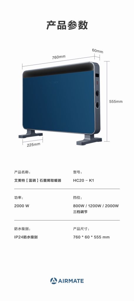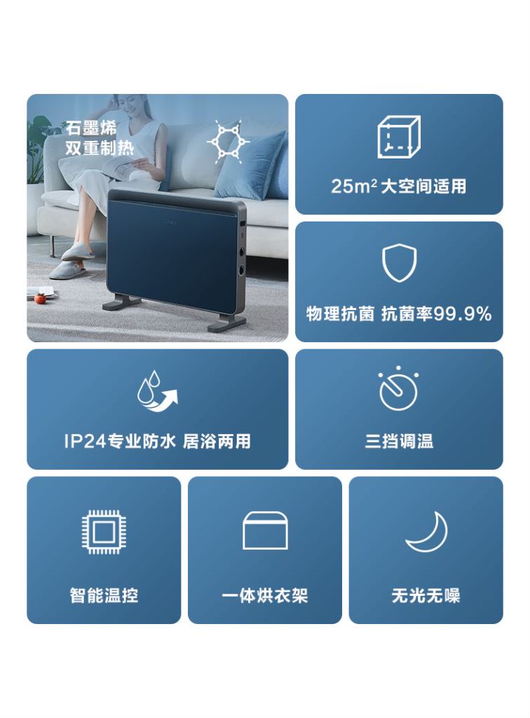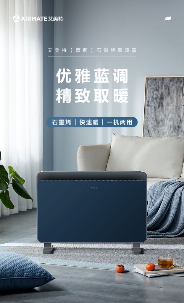 艾美特(AIRMATE)石墨烯取暖器/轻音节能烘衣一体防水速热智能温控欧式快热炉 HC20-K1 宝石蓝