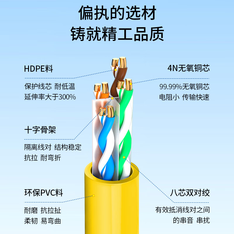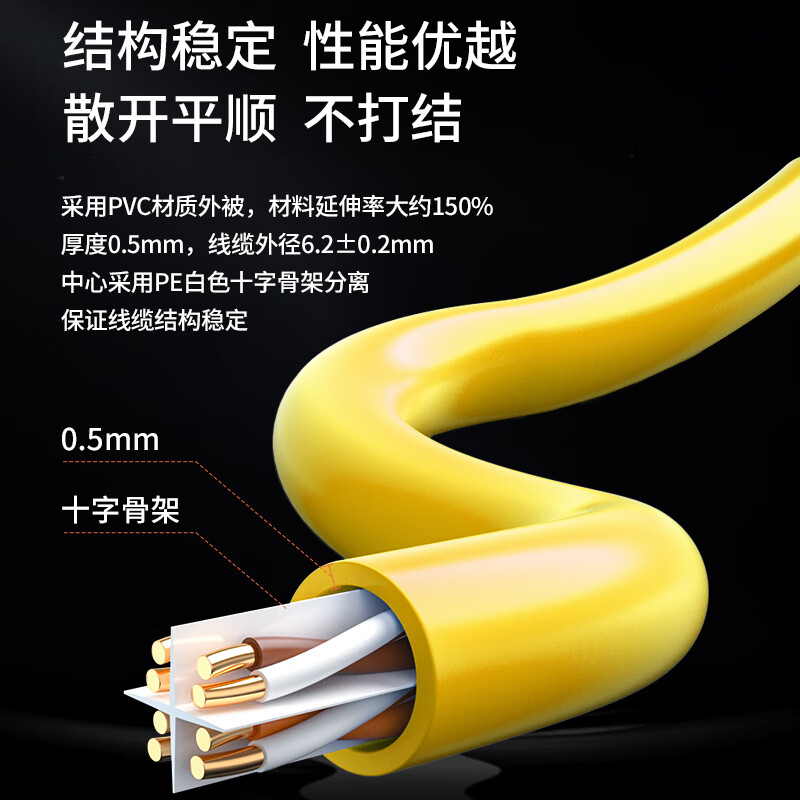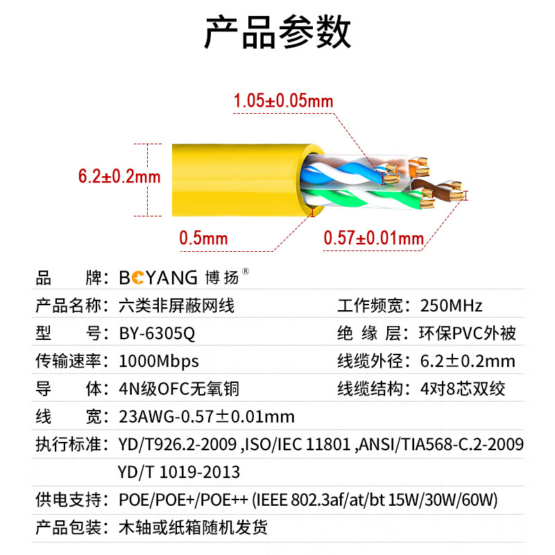 博扬六类网线箱线0.57mm无氧铜线芯室内非屏蔽4对双绞线 CAT6类标准POE供电监控 305米 黄色