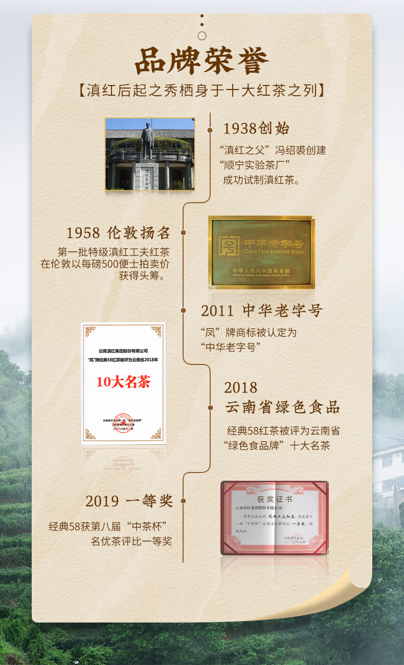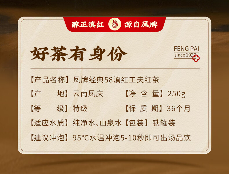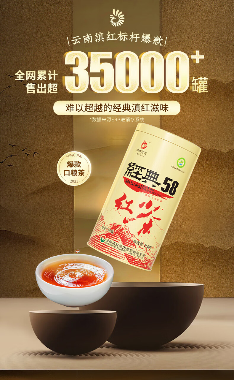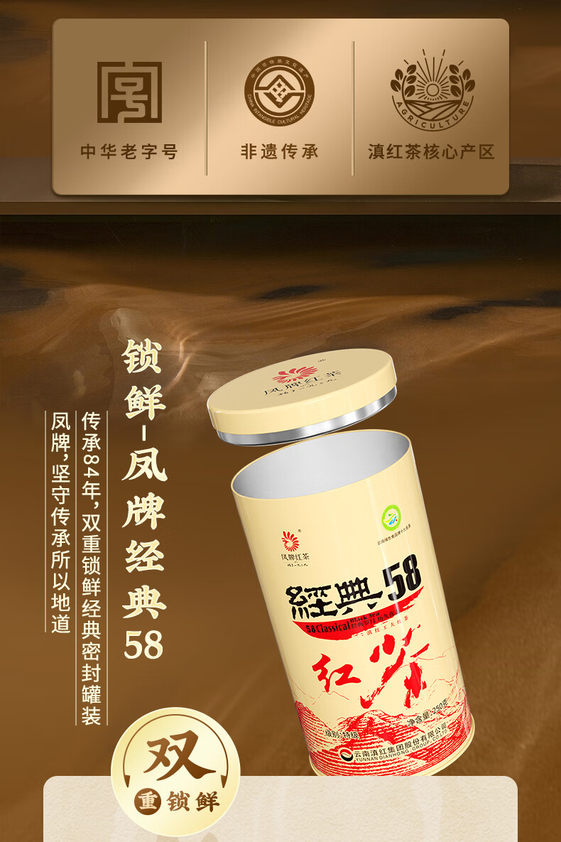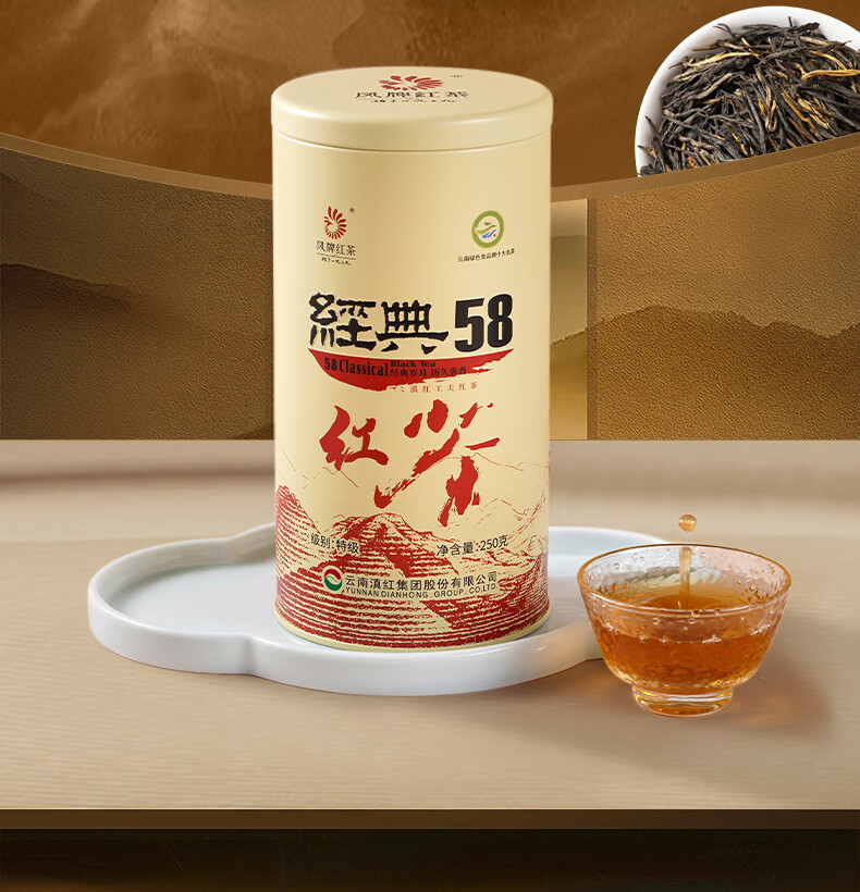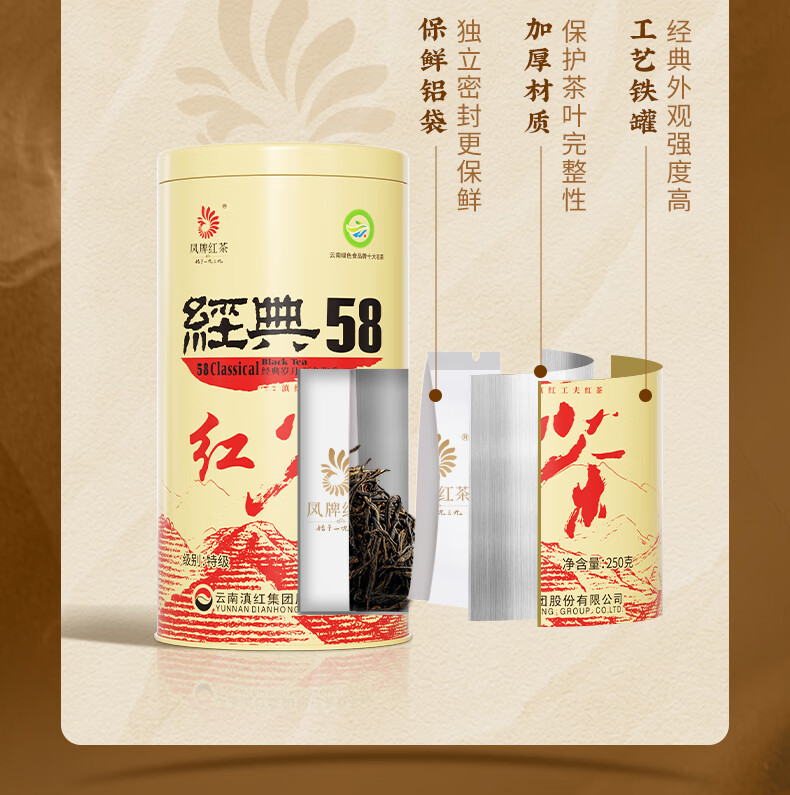 凤牌 红茶 滇红茶 经典58 茶叶 中华老字号 特级浓香型 罐装 250g 滇红茶